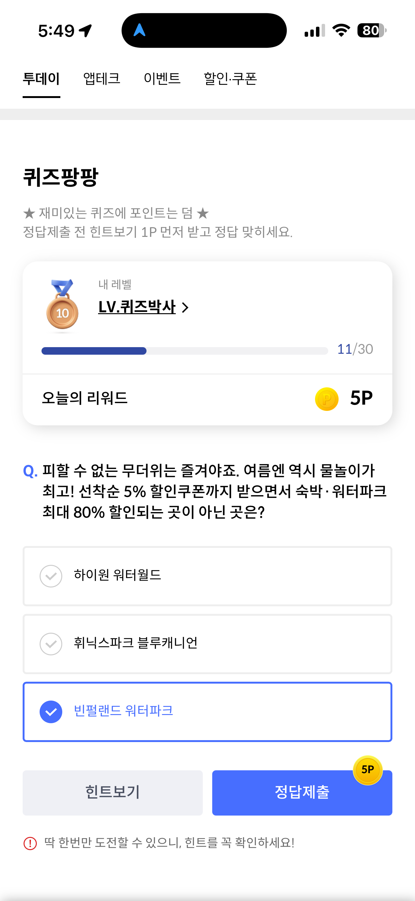 신한카드 퀴즈팡팡 정답은 빈펄랜드 워터파크 입니다