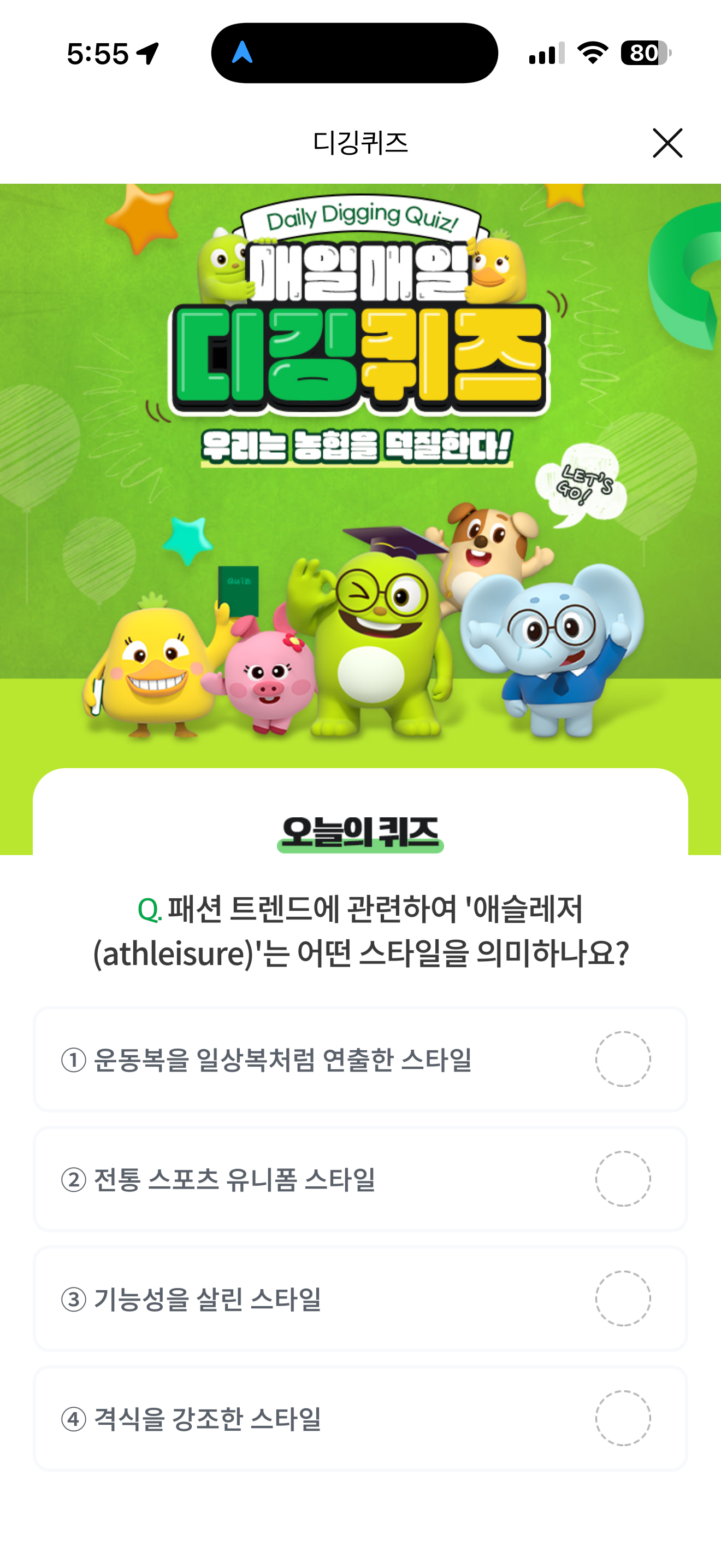 NH올원뱅크 디깅퀴즈 정답은 운동복을 일상복처럼 연출한 스타일 입니다