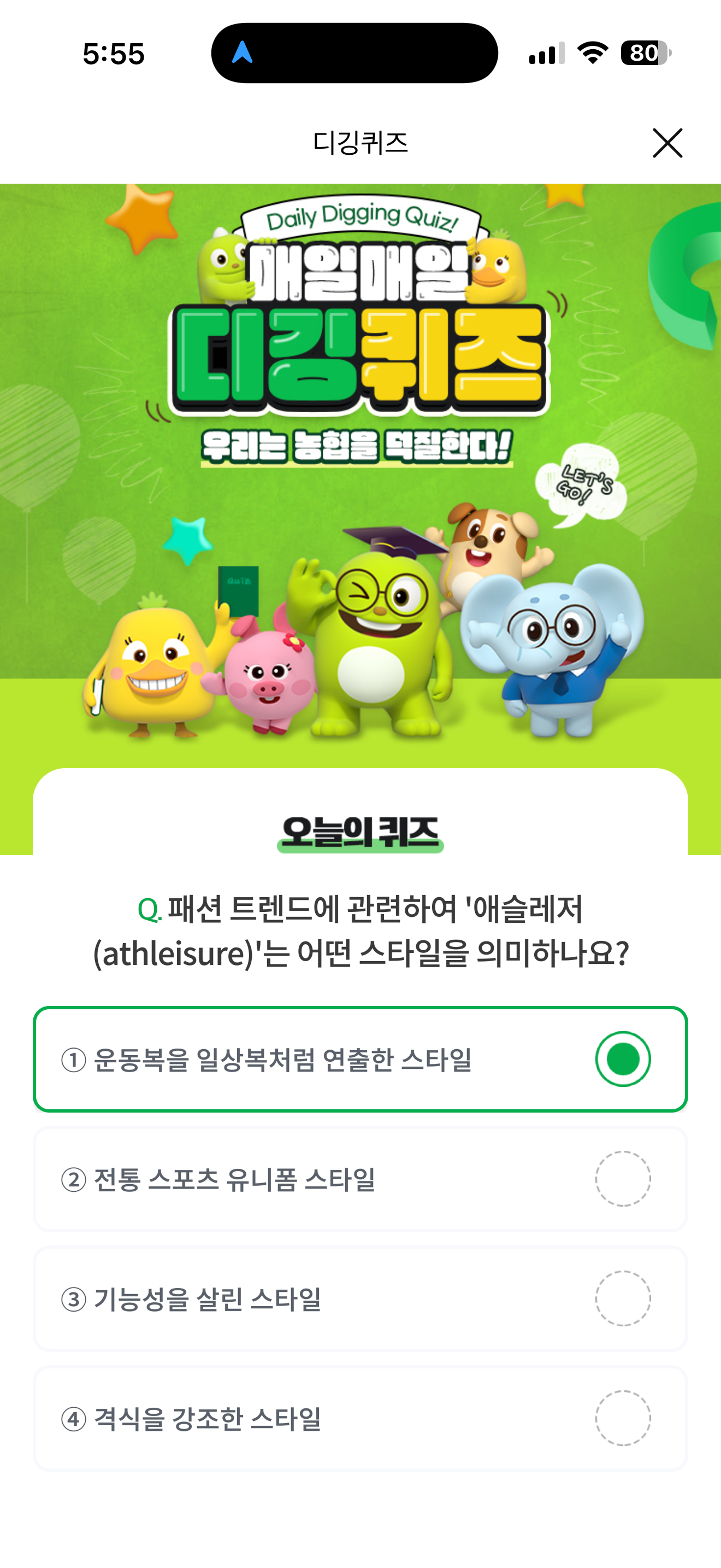 NH올원뱅크 디깅퀴즈 정답은 운동복을 일상복처럼 연출한 스타일 입니다