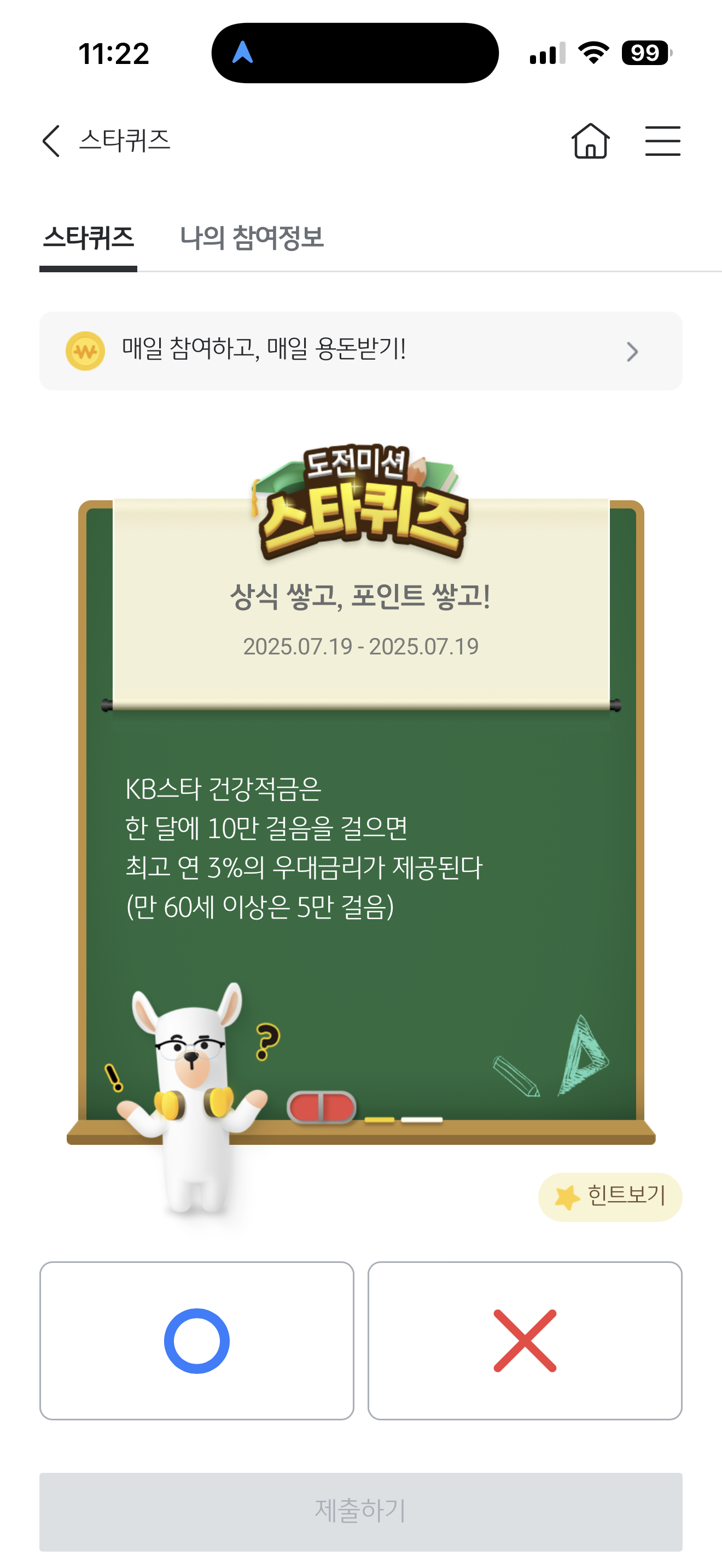 KB스타뱅킹 스타퀴즈 7월 19일 정답(KB스타 건강적금은 한 달에 10만 걸음을 걸으면 최고 연 3%의 우대금리가 제공된다)