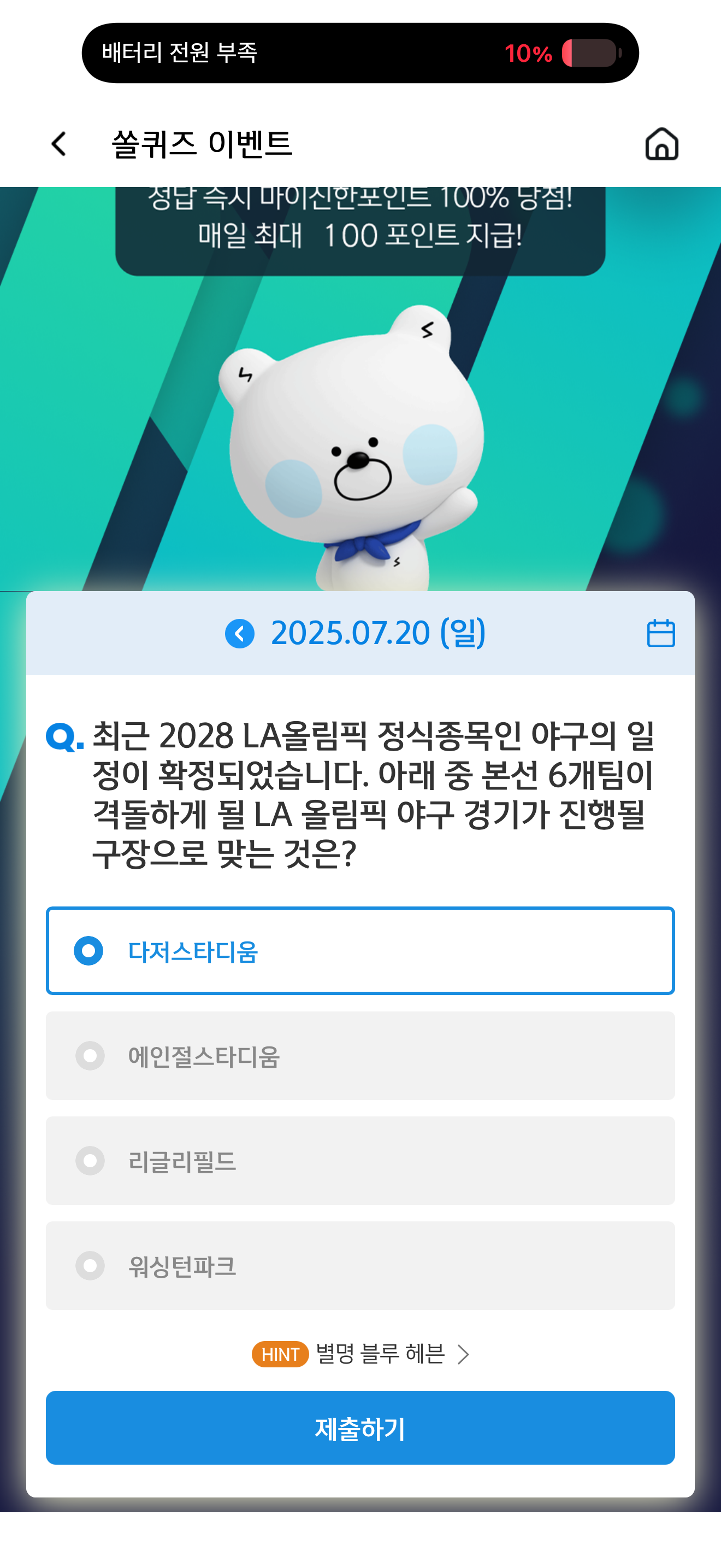 신한 슈퍼SOL 야구/상식 쏠퀴즈 정답은 다저스타디움 입니다