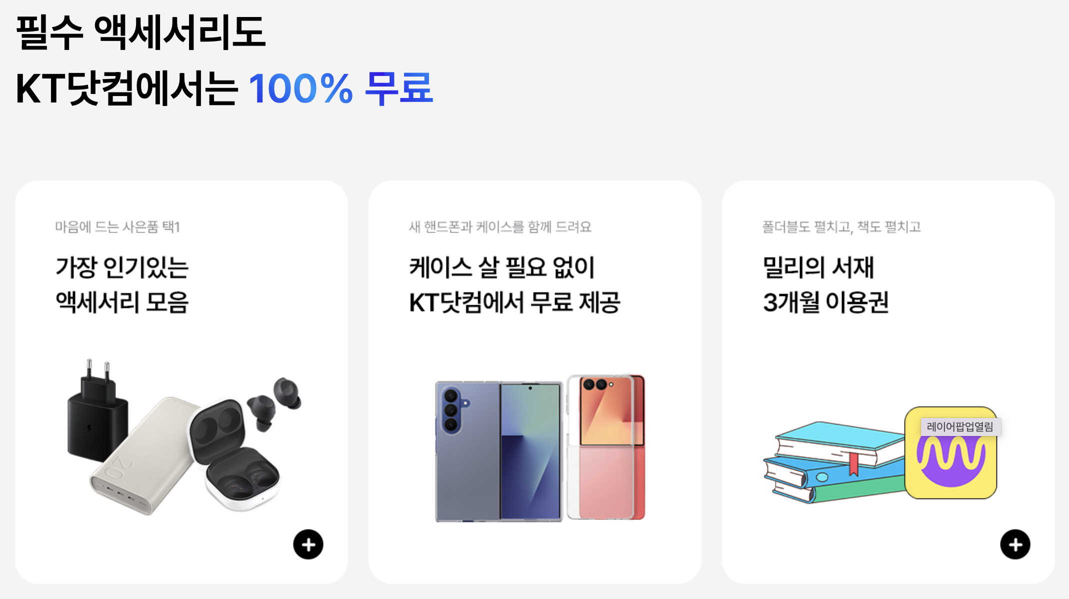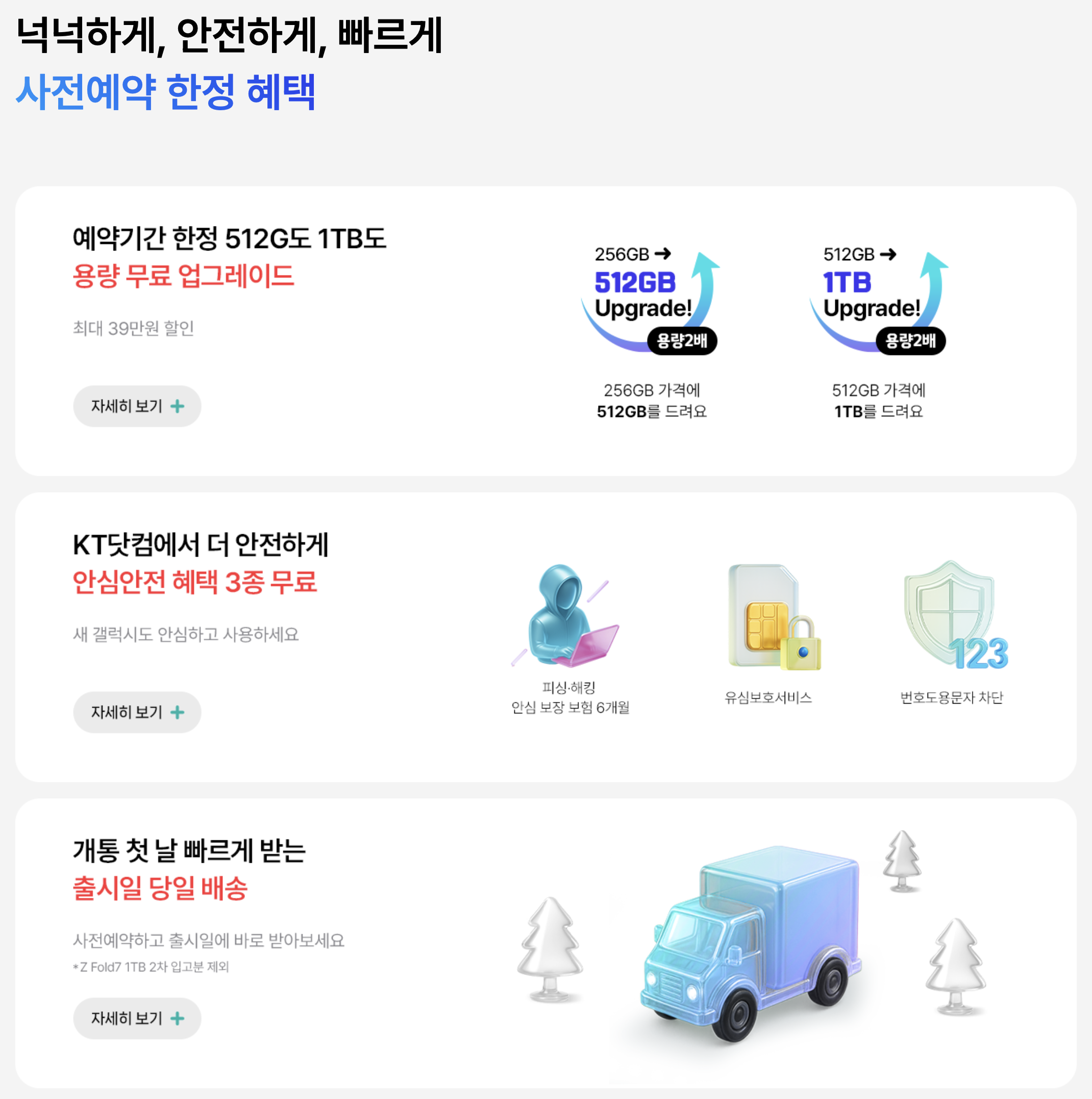 KT의 갤럭시 Z 폴드7 / 플립7 사전예약 혜택은 정말 다양하고 실속 있습니다.특히 고가 요금제 사용 예정이거나, 단말기 교체 주기가 빠른 분들, LTE 기기를 추가 사용하는 분들에게는 혜택이 더욱 큽니다.사전예약 기간은 7월 21일(일)까지!