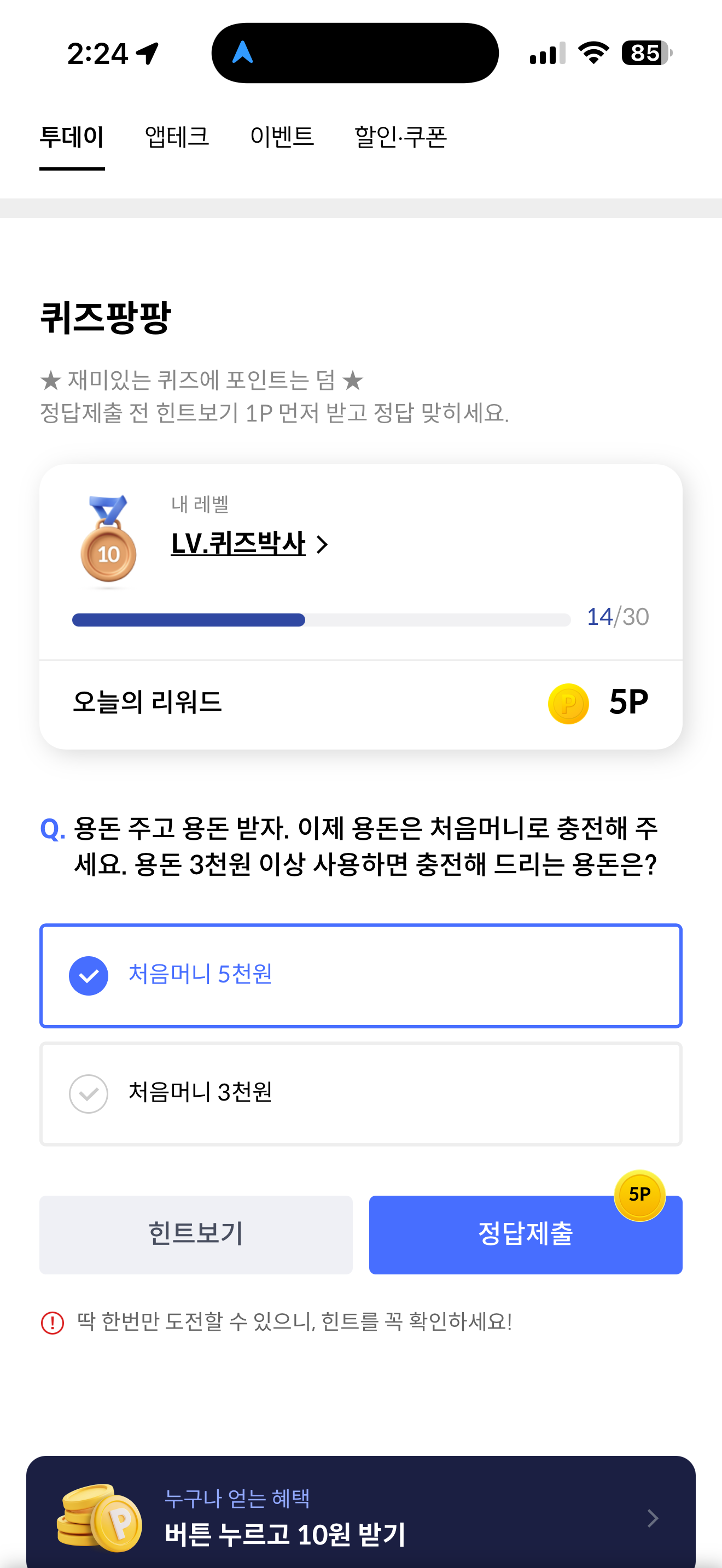 용돈 주고 용돈 받자. 이제 용돈은 처음머니로 충전해 주세요. 용돈 3천원 이상 사용하면 충전해 드리는 용돈은? 보기는 1. 처음머니 5천원 2. 처음머니 3천원 입니다. 용돈을 주고 받을 수 있는 혜택이니 잘 참고해서 활용해 보세요