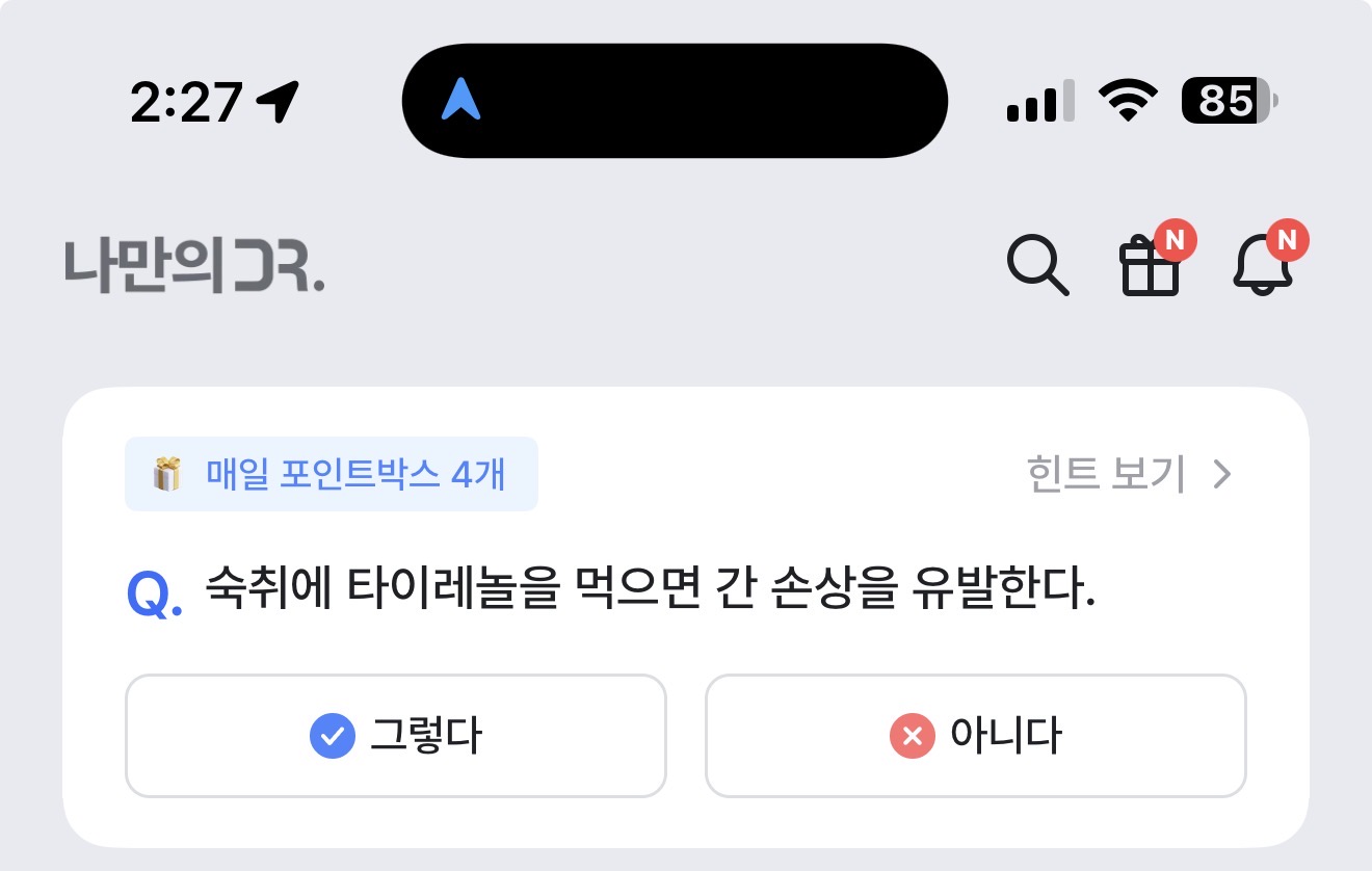 숙취에 타이레놀을 먹으면 간 손상을 유발한다. 그렇다 아니다 선택하면 되는데요. 술을 많이 먹고 숙취에 고통스러워하는 분들 많죠. 그러면 진통제로 타이레놀을 먹기도 하는데요. 과연 숙취에는 타이레놀을 먹으면 간 손상을 유발할까요? 참고해 보세요