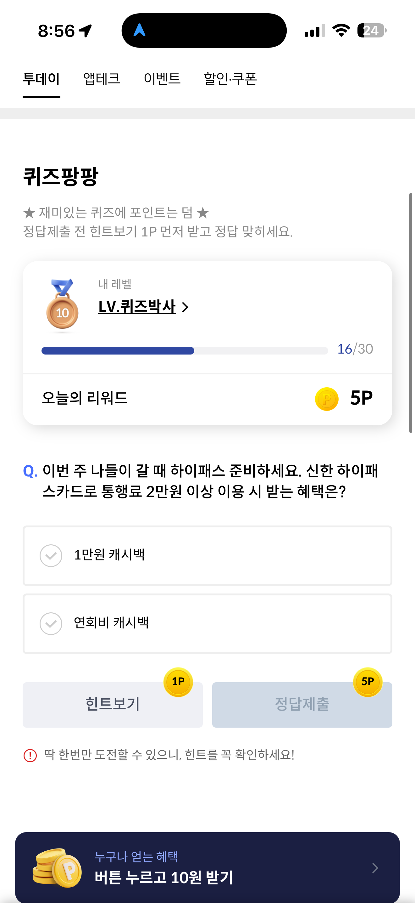 신한카드 퀴즈팡팡 정답은 1만원 캐시백 입니다