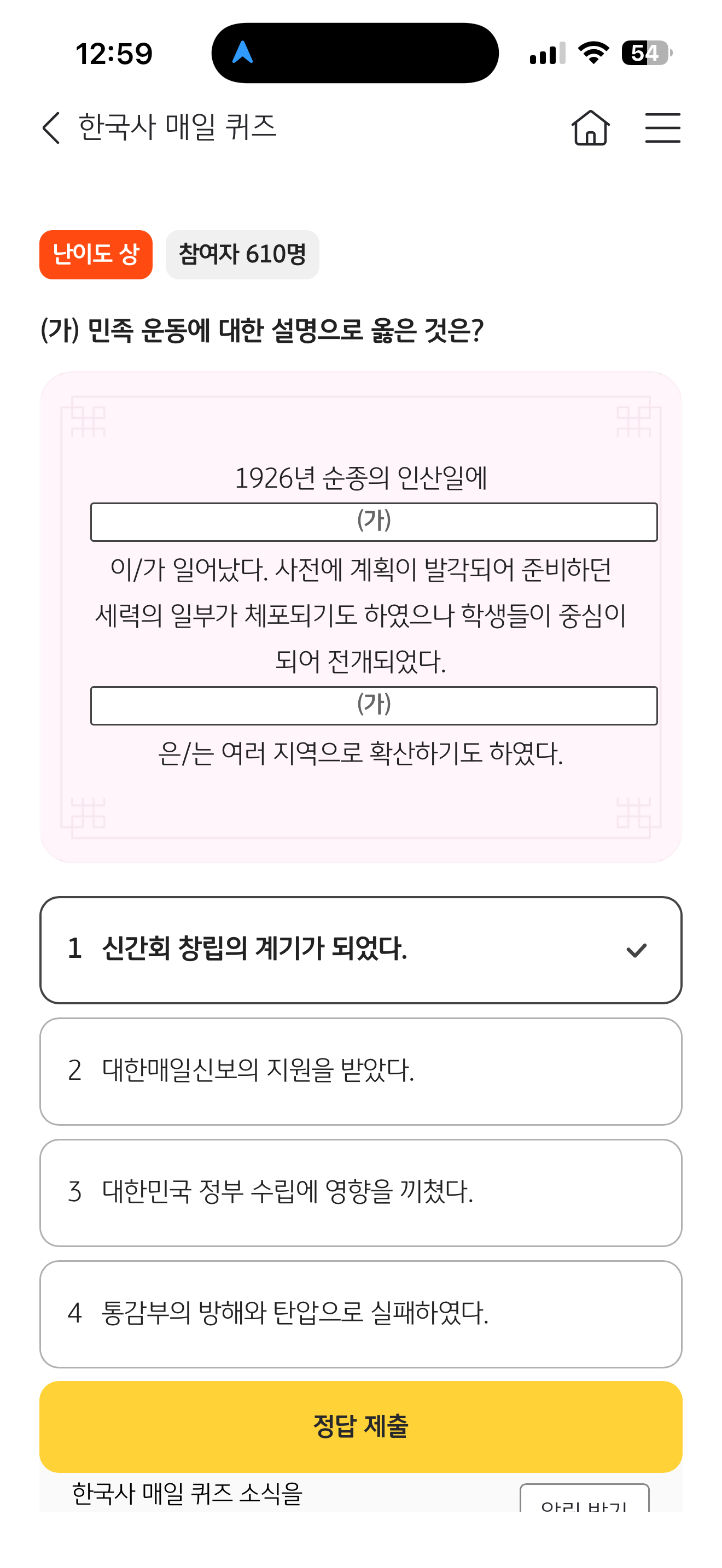 (가) 민족 운동에 대한 설명으로 옳은 것은? 1962년 순종의 인산일에 (가) 이/가 일어났다. 사전에 계획이 발각되어 준비하던 세력의 일부가 체포되기도 하였으나 학생들이 중심이 되어 전개되었다 (가) 은/는 여러 지역으로 확산하기도 하였다 보기는 1. 신간회 창립의 계기가 되었다 2. 대한매일신보의 지원을 받았다 3. 대한민국 정부 수립에 영향을 끼쳤다 4. 통감부의 방해와 탄압으로 실패하였다