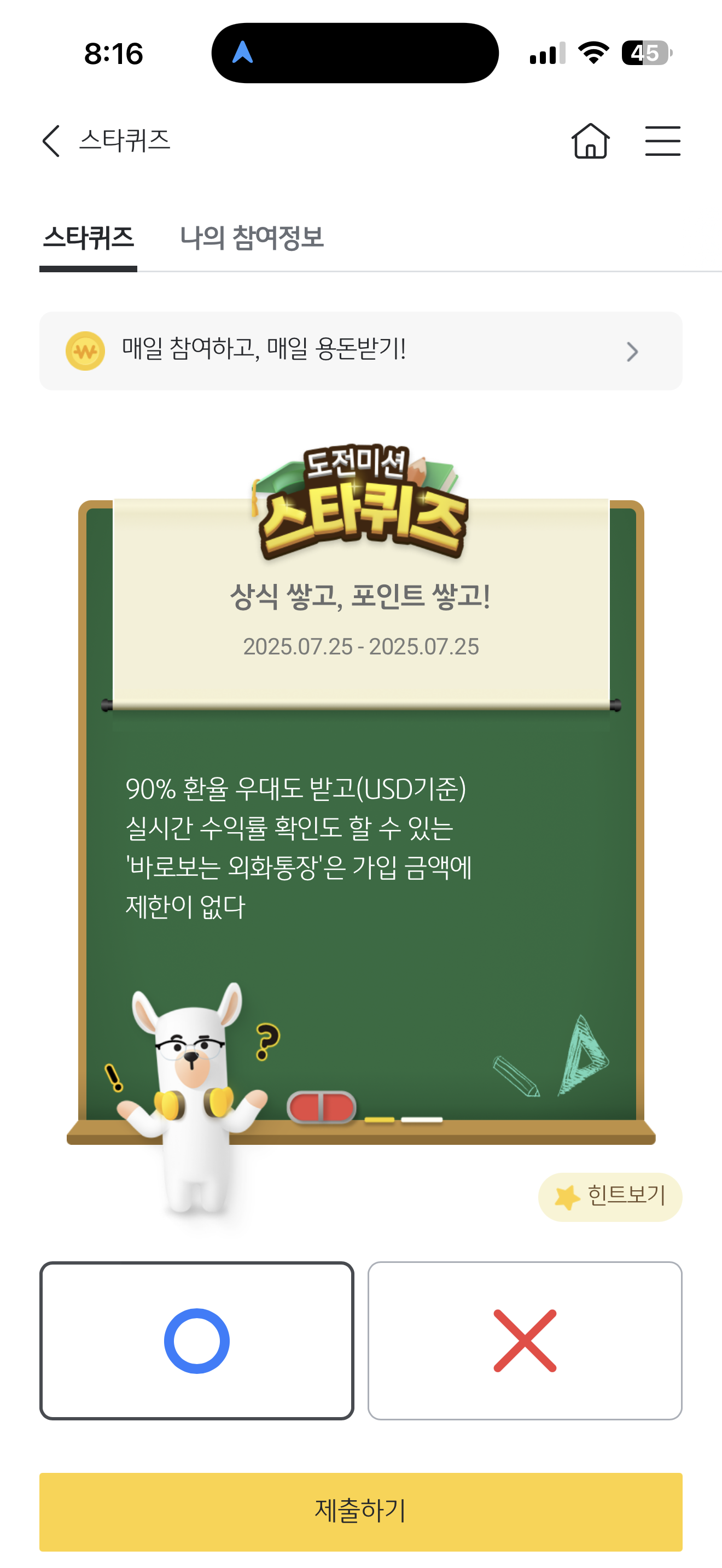 90% 환율 우대도 받고(USD기준) 실시간 수익률 확인도 할 수 있는 '바로보는 외화통장'은 가입 금액에 제한이 없다 O, X 퀴즈인데요. 외화를 관리할때는 외화통장을 활용하시면 좋은데요. 90% 환율 우대 혜택도 있으니 참고해서 활용해 보세요