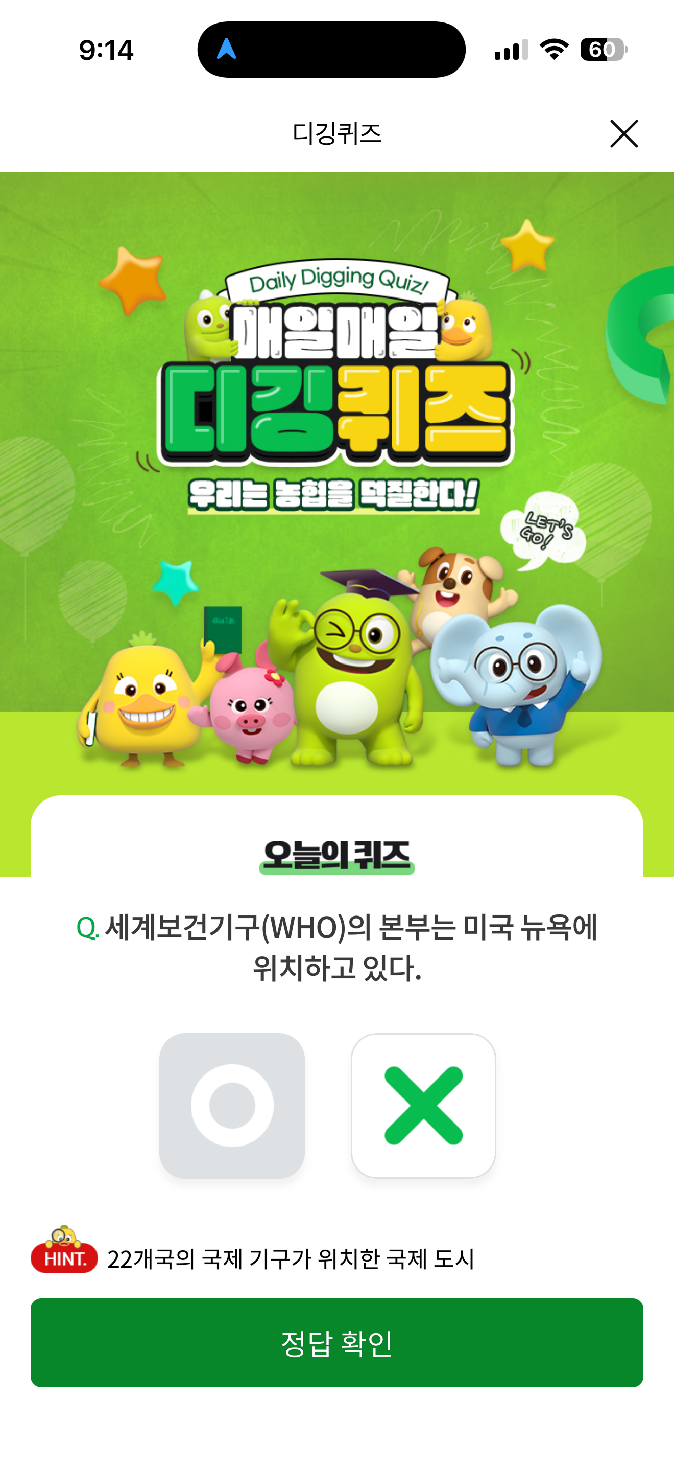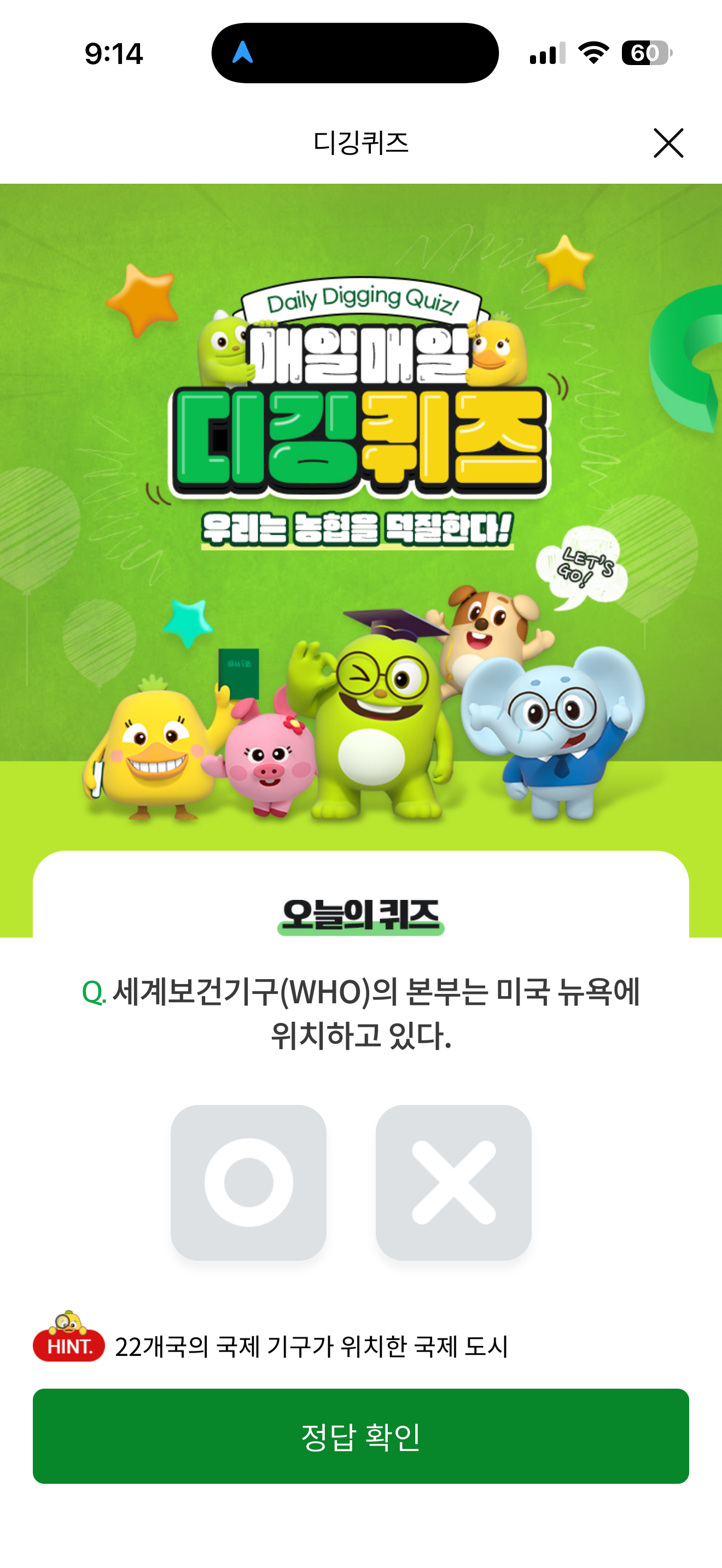 NH올원뱅크 디깅퀴즈 7월 25일 정답(세계보건기구(WHO)의 본부는 미국 뉴욕에 위치하고 있다)