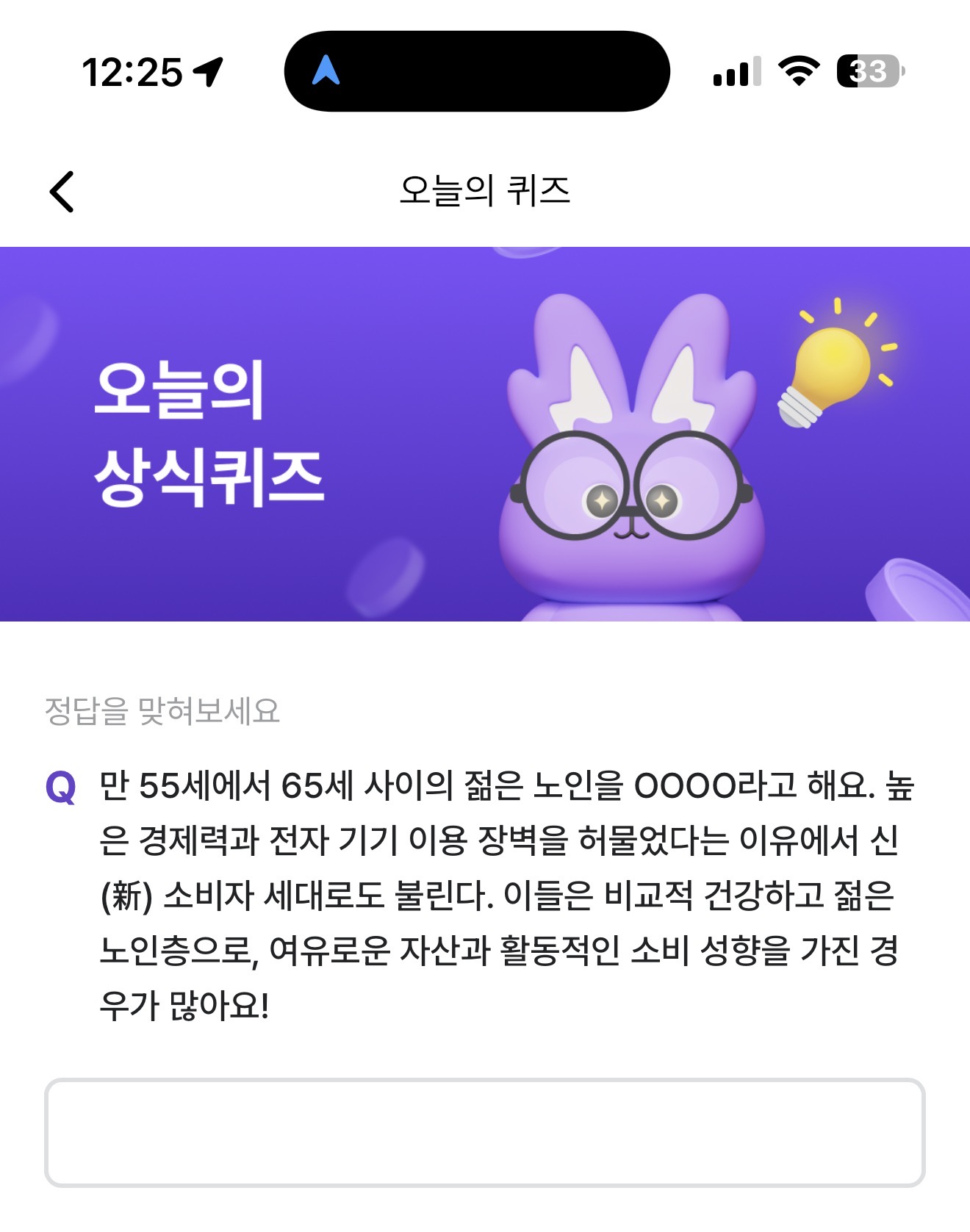 만 55세에서 65세 사이의 젊은 노인을 OOOO라고 해요. 높은 경제력과 전자 기기 이용 장벽을 허물었다는 이유에서 신 소비자 세대로도 불린다. 이들은 비교적 건강하고 젊은 노인층으로, 여유로운 자산과 활동적인 소비 성향을 가진 경우가 많아요! 주관식 퀴즈인데요.
