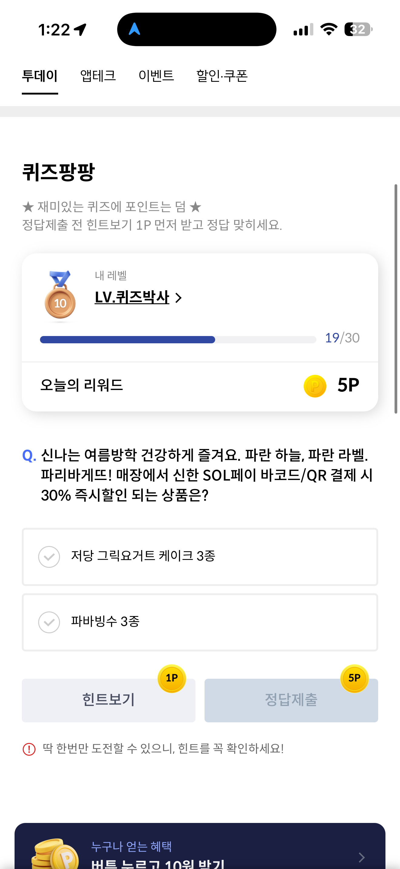신나는 여름방학 건강하게 즐겨요. 파란 하늘, 파란 라벨. 파리바게뜨! 매장에서 신한 SOL페이 바코드/QR 결제 시 30% 즉시할인 되는 상품은? 보기는 1. 저당 그릭요거트 케이크 3종 2. 파바빙수 3종 입니다.