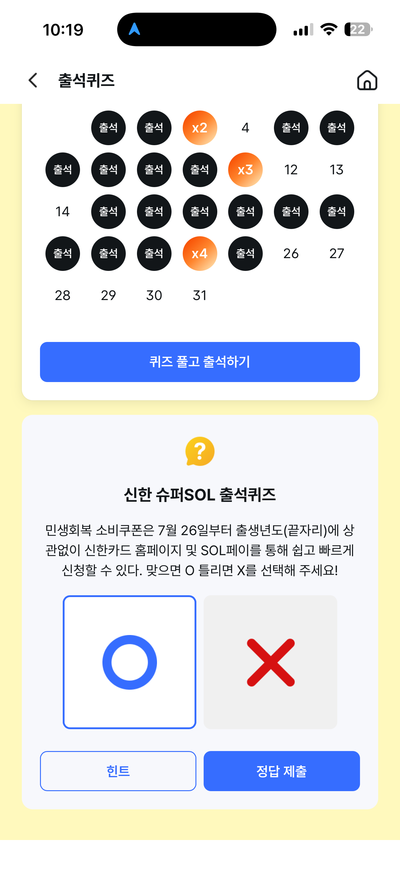 신한 슈퍼SOL 출석퀴즈 정답은 O 입니다