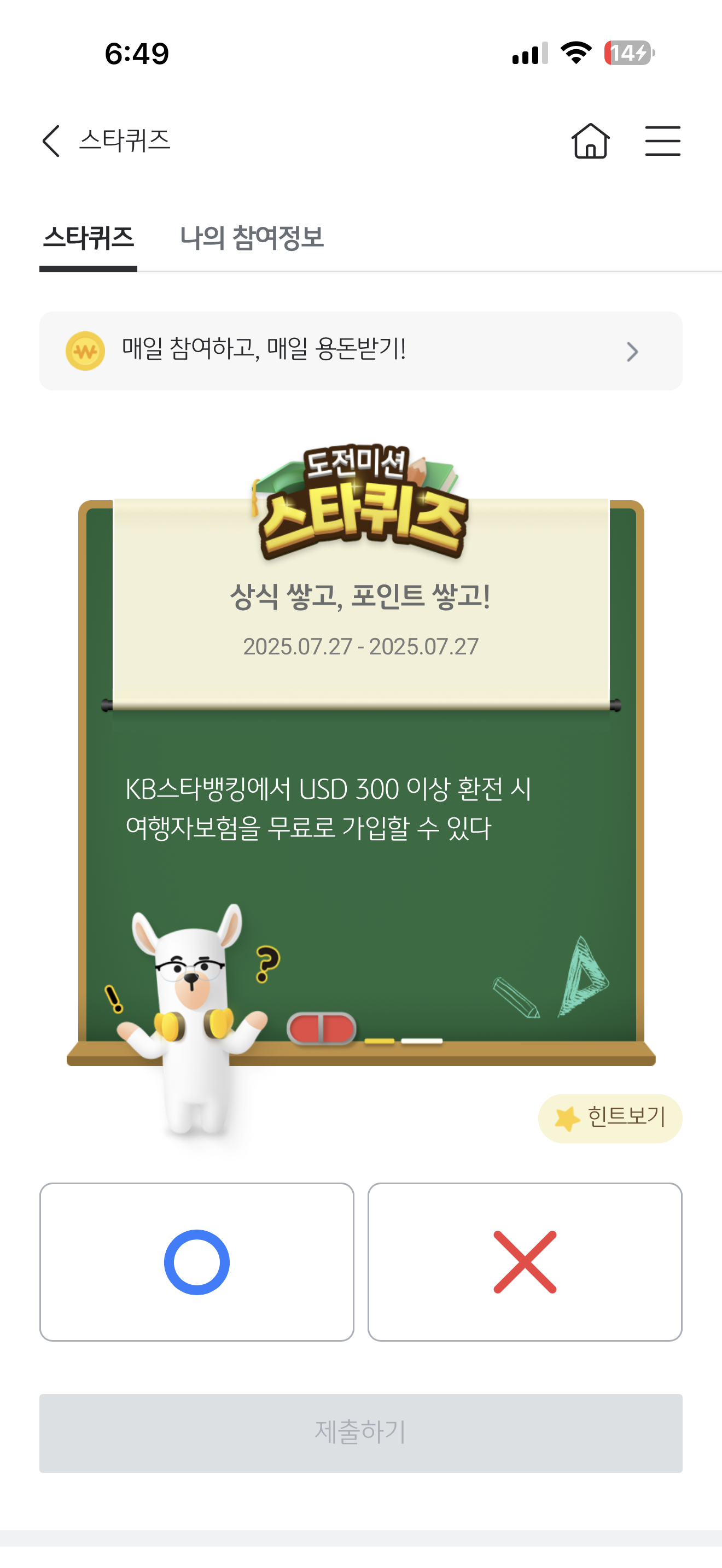 KB스타뱅킹 스타퀴즈 7월 27일 정답(KB스타뱅킹에서 USD 300 이상 환전 시 여행자보험을 무료로 가입할 수 있다)
