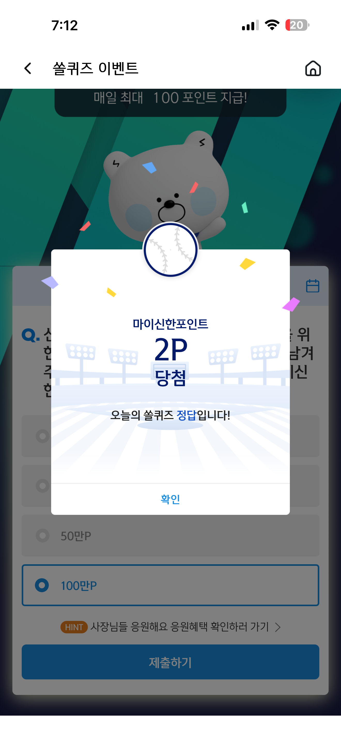 신한 슈퍼SOL 야구/상식 쏠퀴즈 정답은 100만P 입니다
