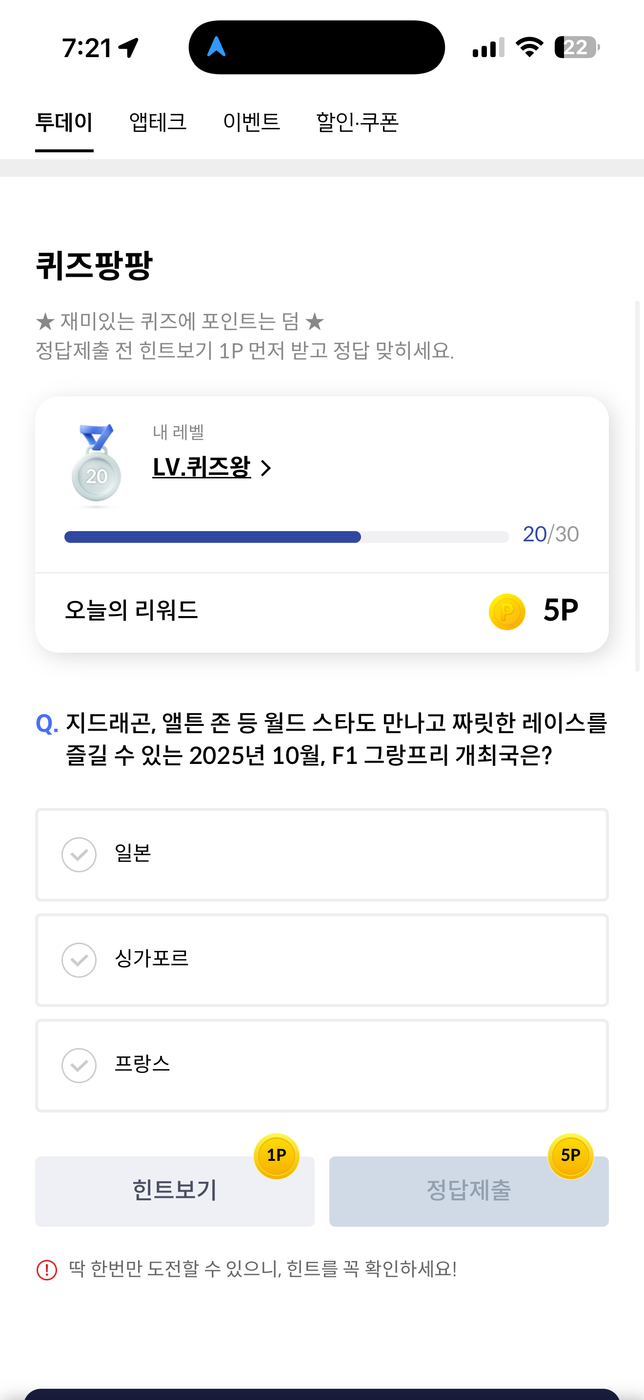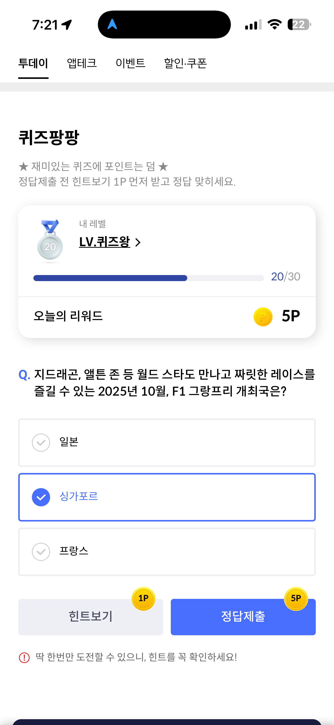 신한카드 퀴즈팡팡 7월 27일 정답(지드래곤, 앨튼 존 등 월드 스타도 만나고 짜릿한 레이스를 즐길 수 있는 2025년 10월, F1 그랑프리 개최국은?)