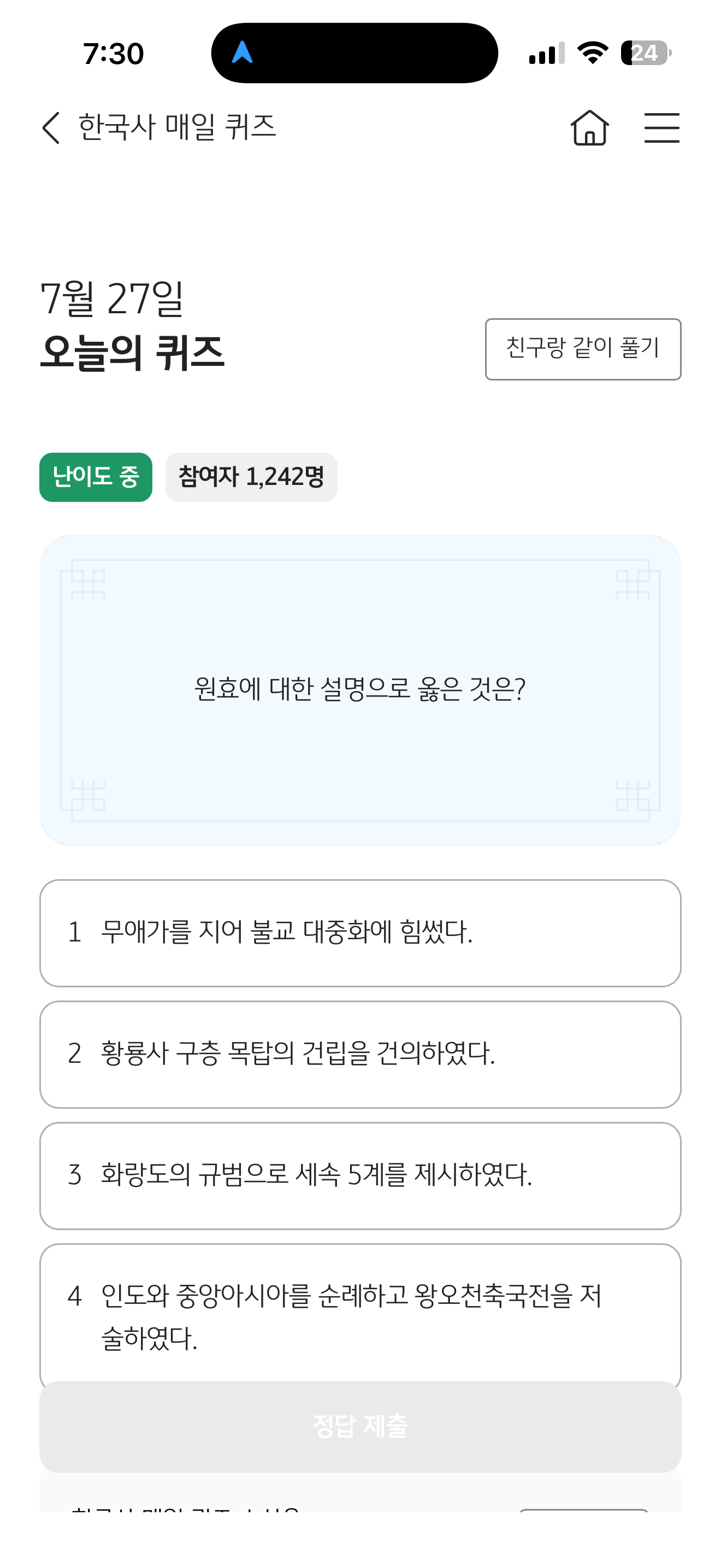 KB스타뱅킹 한국사 매일 퀴즈 7월 27일 문제입니다