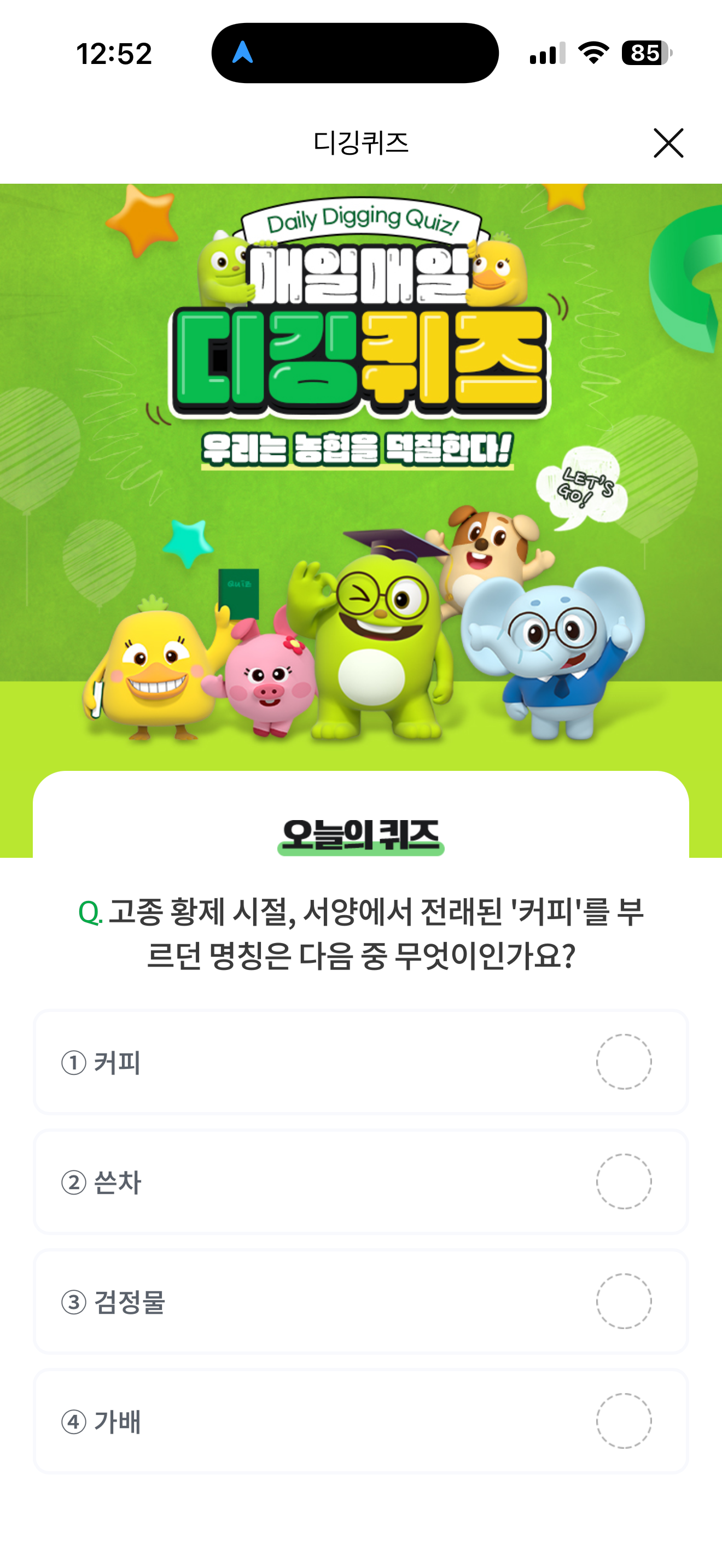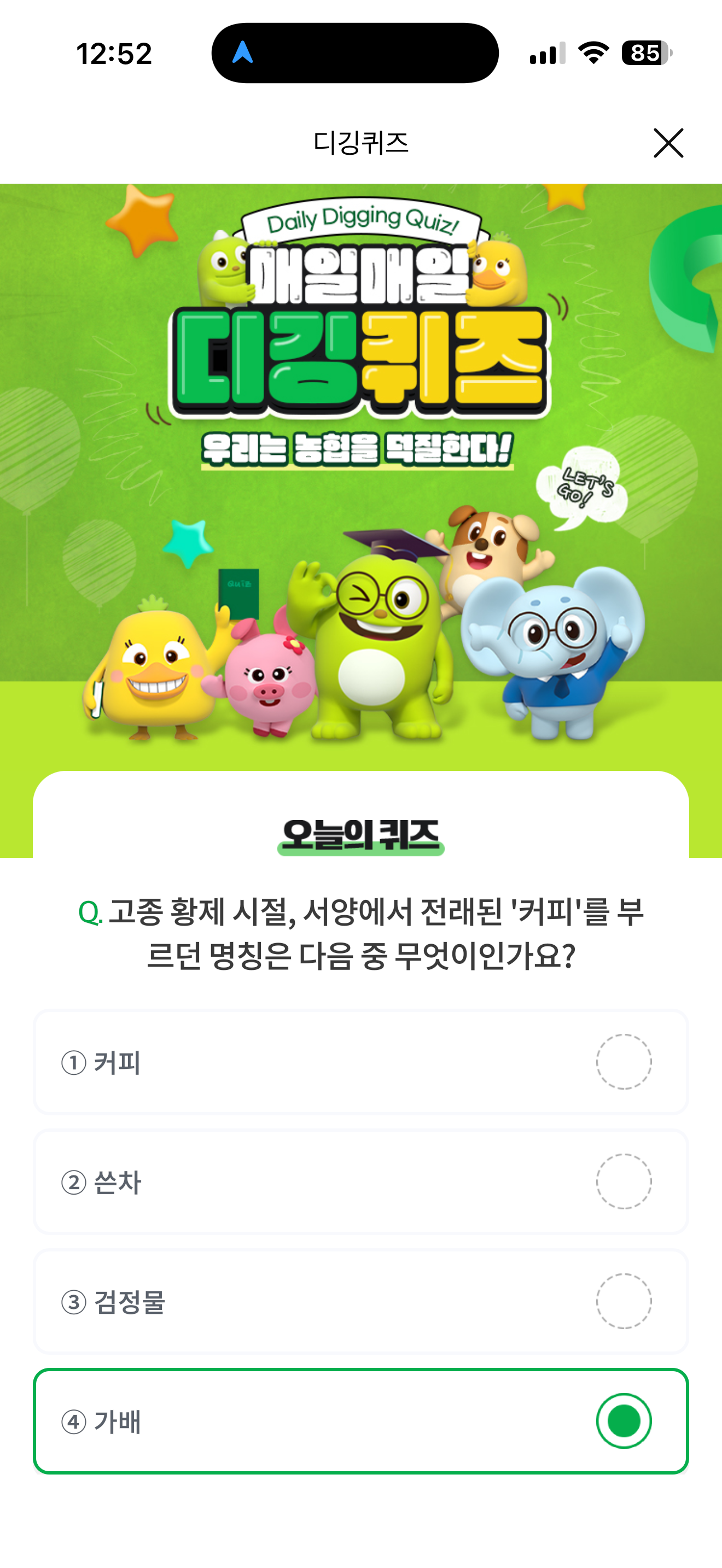 NH올원뱅크 디깅퀴즈 7월 28일 정답(고종 황제 시절, 서양에서 전래된 '커피'를 부르던 명칭은 다음 중 무엇이인가요?)