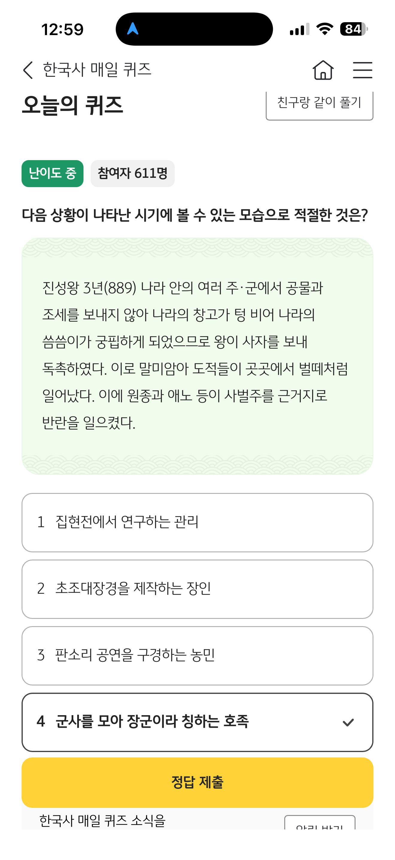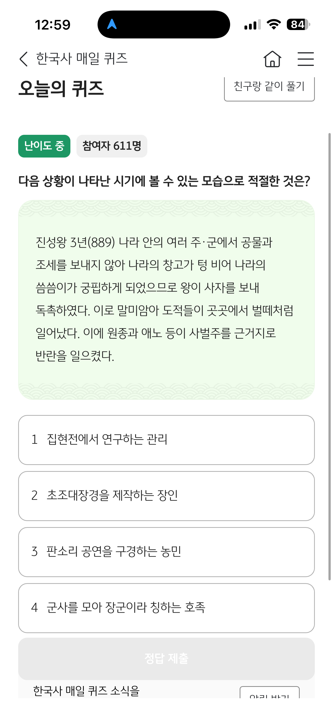 다음 상황이 나타난 시기에 볼 수 있는 모습으로 적절한 것은? 진성왕 3년(889) 나라 안의 여러 주 군에서 공물과 조세를 보내지 않아 나라의 창고가 텅 비어 나라의 씀씀이가 궁핍하게 되었으므로 왕이 사자를 보내 독촉하였다. 이로 말미암아 도적들이 곳곳에서 벌떼처럼 일어났다. 이에 원종과 애노 등이 사벌주를 근거지로 반란을 일으켰다 보기는 1. 집협전에서 연구하는 관리 2. 초조대장경을 제작하는 장인 3. 판소리 공연을 구경하는 농민 4. 군사를 모아 장군이라 칭하는 호족