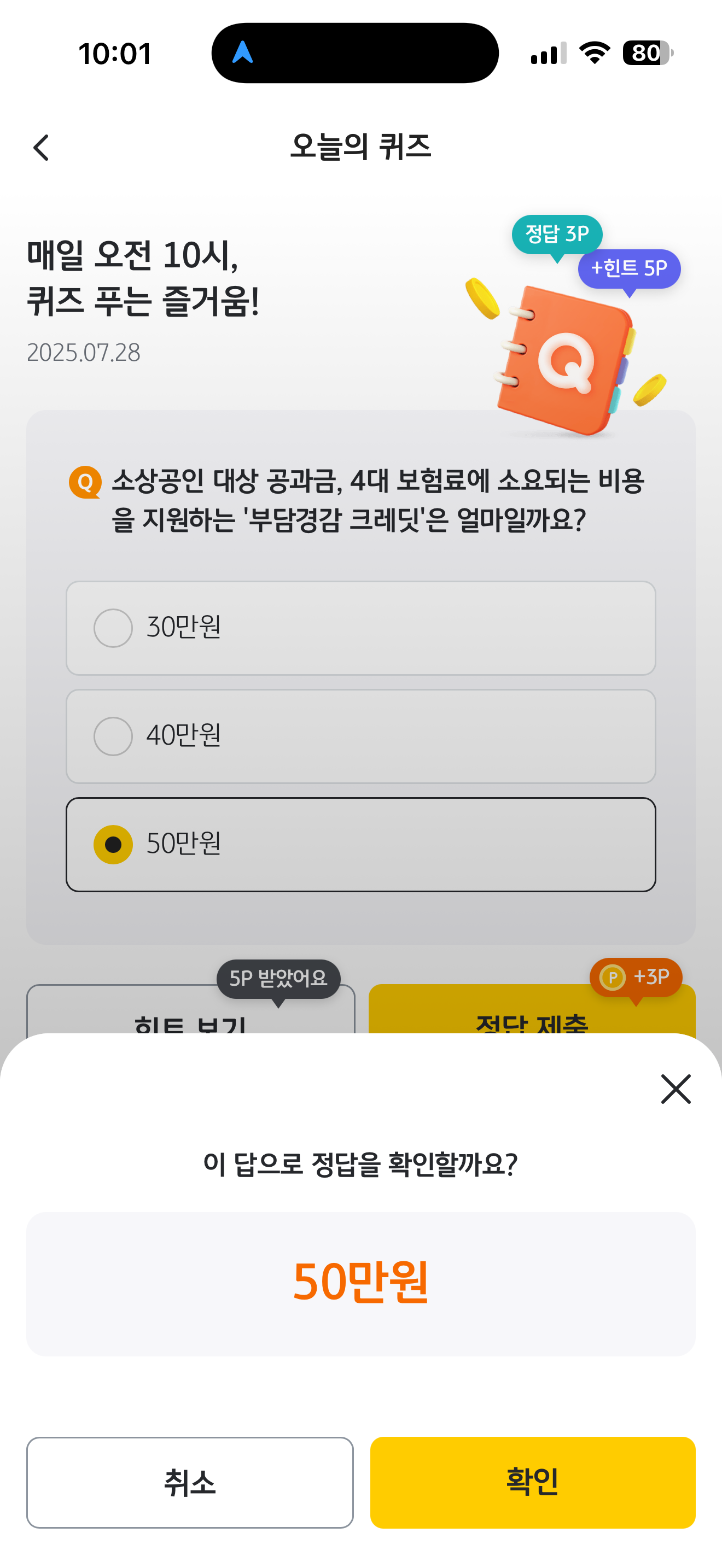KB Pay 오늘의 퀴즈 정답은 50만원 입니다