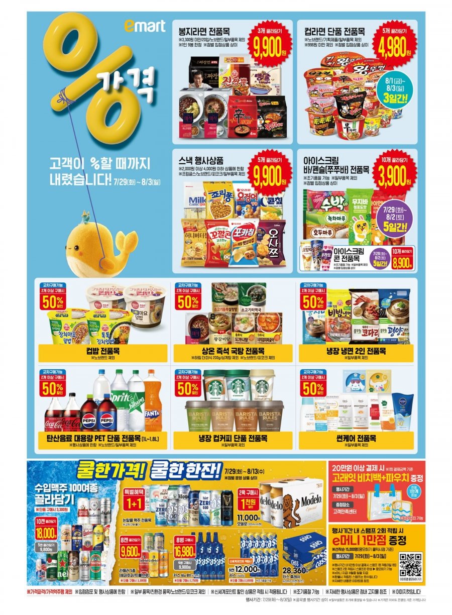 7월 29일(화)~8월 3일(일) 이마트 고래잇 전단지 할인 행사를 합니다. 요즘 마트 경쟁이 치열해 지면서 특가 정보들이 많이 나오는데요. 어떤 할인 정보가 있는지 잘 참고해서 스마트한 쇼핑 하세요.