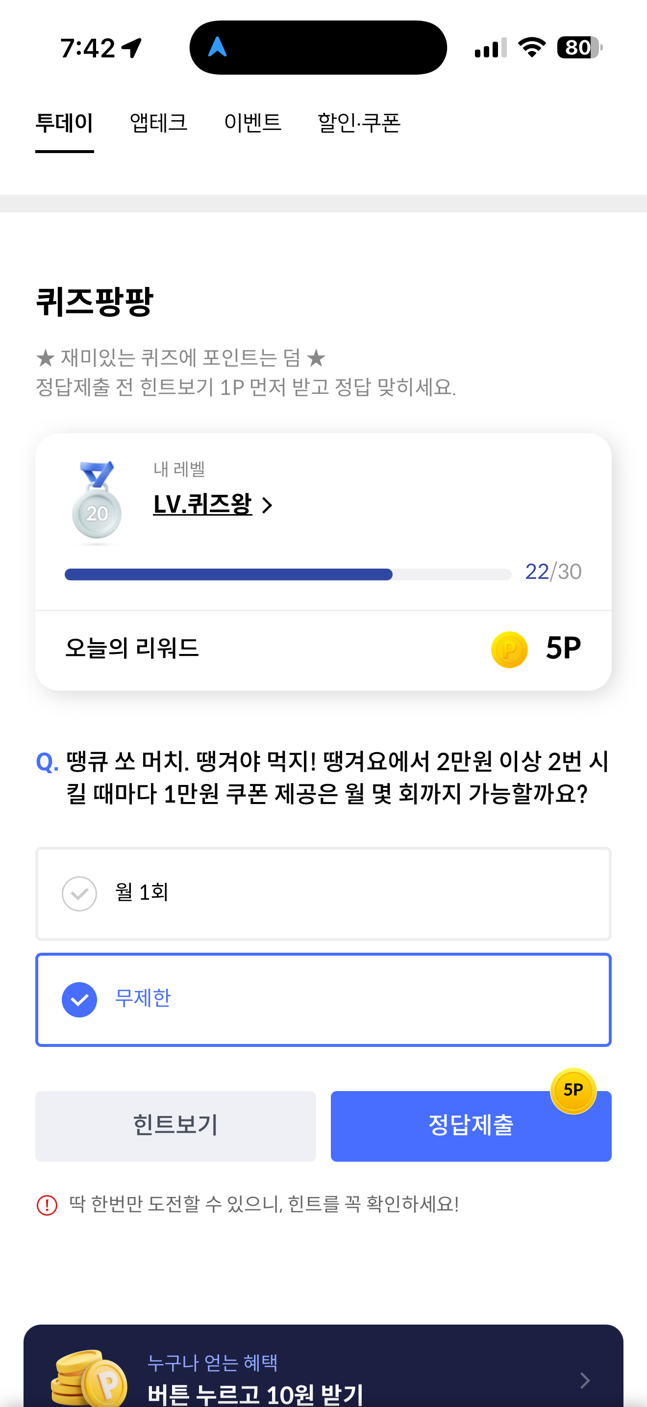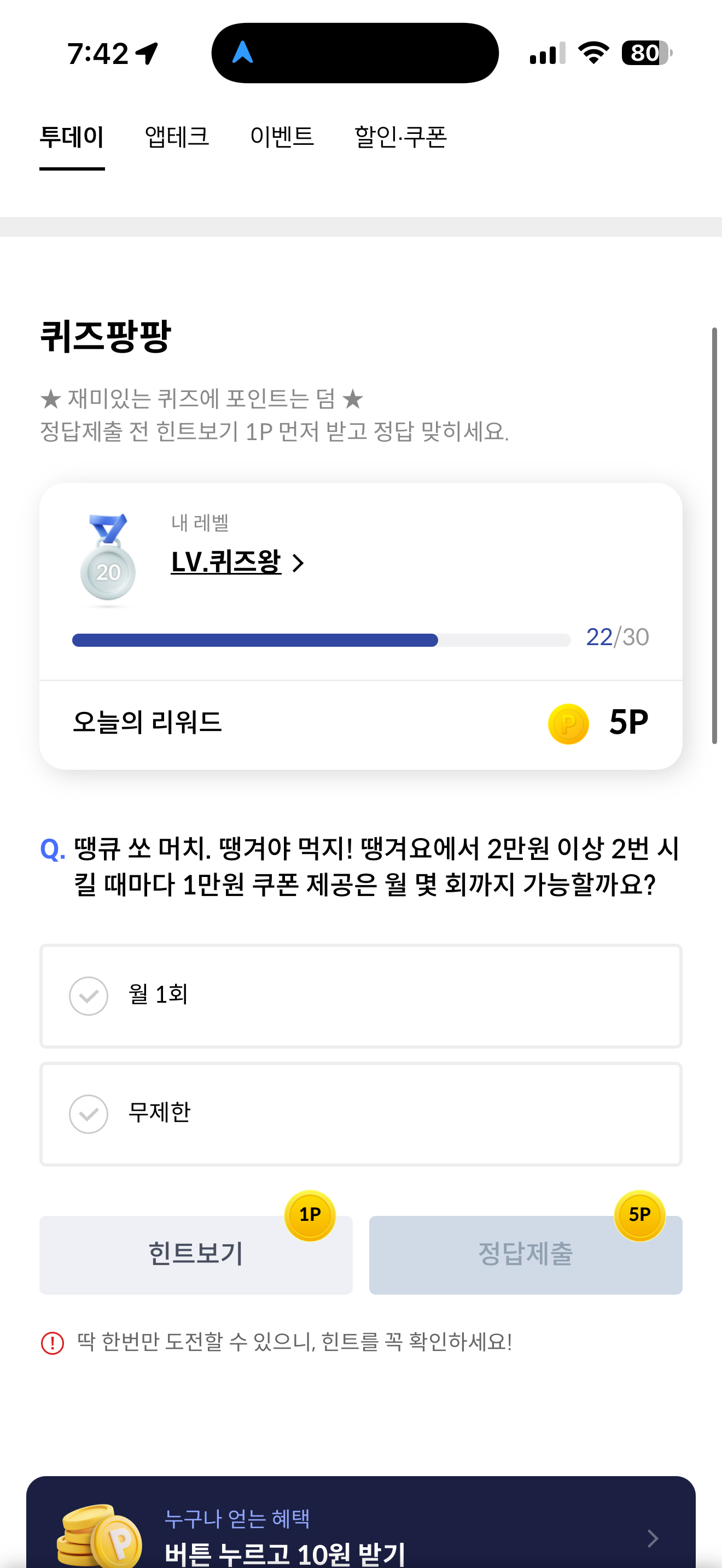 신한카드 퀴즈팡팡 7월 29일 정답(땡큐 쏘 머치. 땡겨야 먹지! 땡겨요에서 2만원 이상 2번 시킬 때마다 1만원 쿠폰 제공은 월 몇 회까지 가능할까요?)
