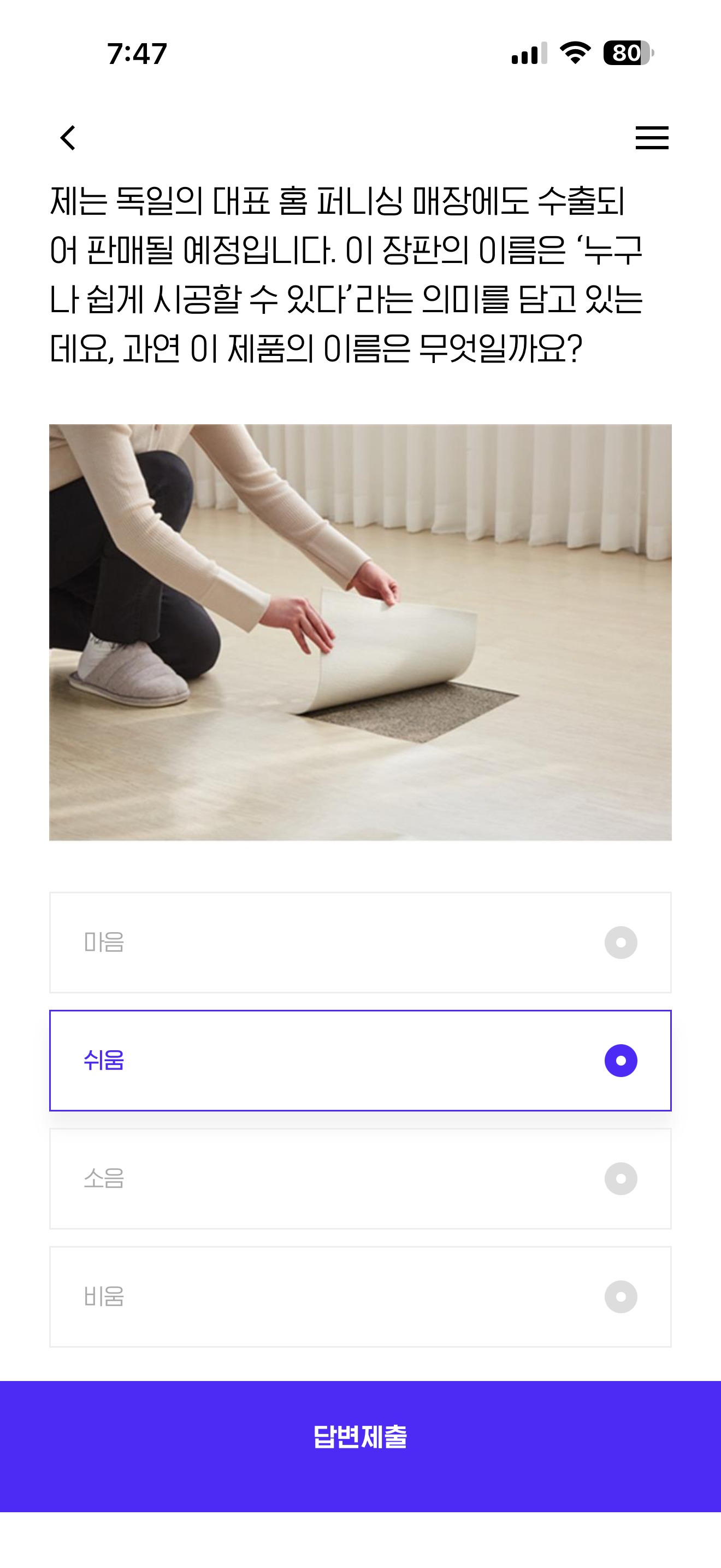 철거 없이 붙이기만 하면 시공 끝! 현대 L&C의 DIY 장판은 많은 사랑을 받고 있으며, 이제는 독일의 대표 홈 퍼니싱 매장에도 수출되어 판매될 예정입니다. 이 장판의 이름은 '누구나 쉽게 시공할 수 있다' 라는 의미를 담고 있는데요. 과연 이 제품의 이름은 무엇일까요? 보기는 1. 마음 2. 쉬움 3. 소음 4. 비움 입니다