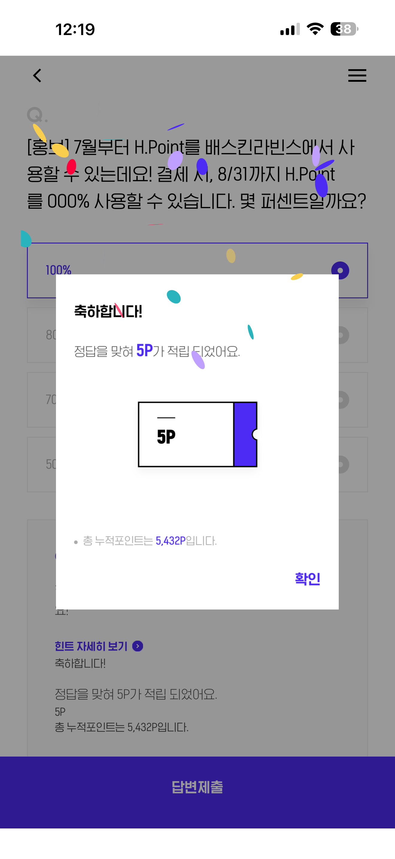 7월부터 H.Point를 배스킨라빈스에서 사용할 수 있는데요! 결제 시, 8/31까지 H.Point를 OOO% 사용할 수 있습니다 몇 퍼센트일까요? 보기는 1. 100% 2. 80% 3. 70% 4. 50% 입니다