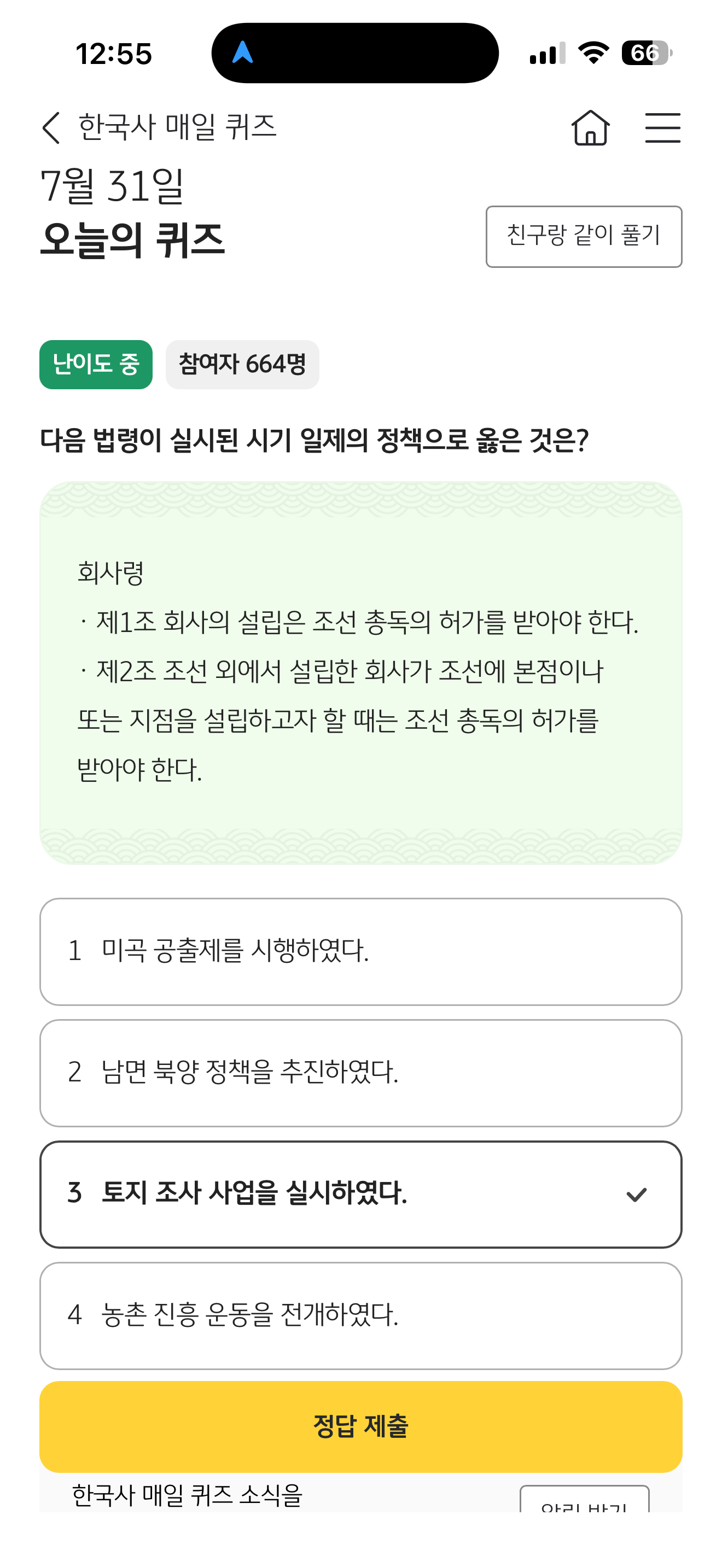 KB스타뱅킹 한국사 매일 퀴즈 7월 31일 정답(다음 법령이 실시된 시기 일제의 정책으로 옳은 것은?)