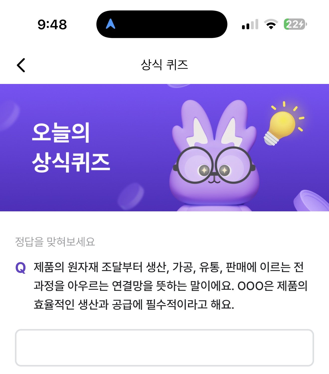 제품의 원자재 조달부터 생산, 가공, 유통, 판매에 이르는 전과정을 아우르는 연결망을 뜻하는 말이에요. OOO은 제품의 효율적인 생산과 공급에 필수적이라고 해요. 주관식 퀴즈인데요