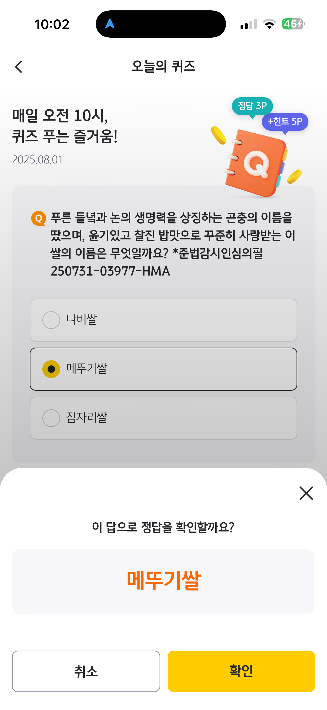 KB Pay 오늘의 퀴즈 정답은 메뚜기쌀 입니다