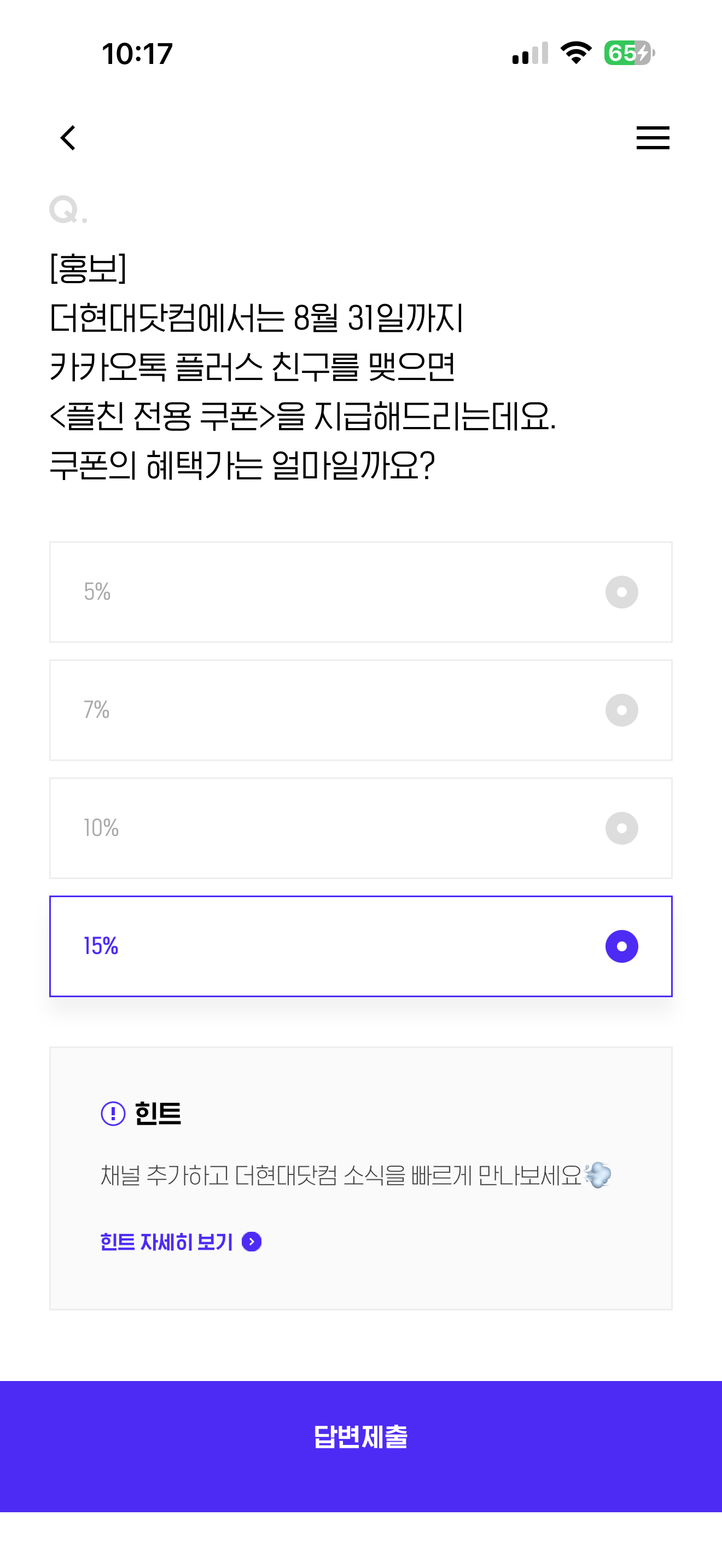 더현대닷컴에서는 8월 31일까지 카카오톡 플러스 친구를 맺으면 <플친 전용 쿠폰>을 지급해드리는데요. 쿠폰의 혜택가는 얼마일까요? 보기는 1. 5% 2. 7% 3. 10% 4.15% 입니다