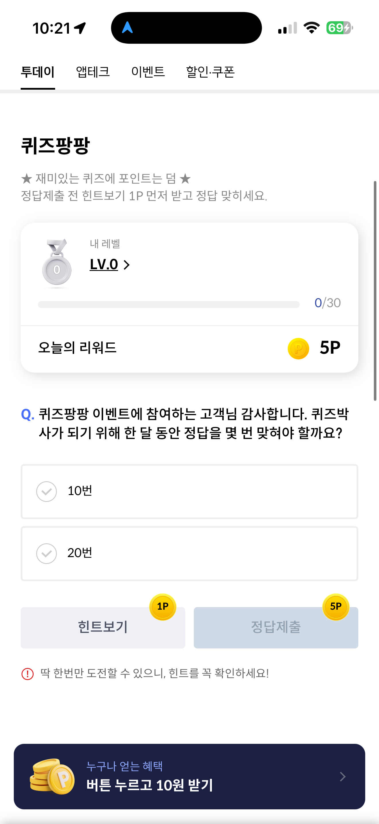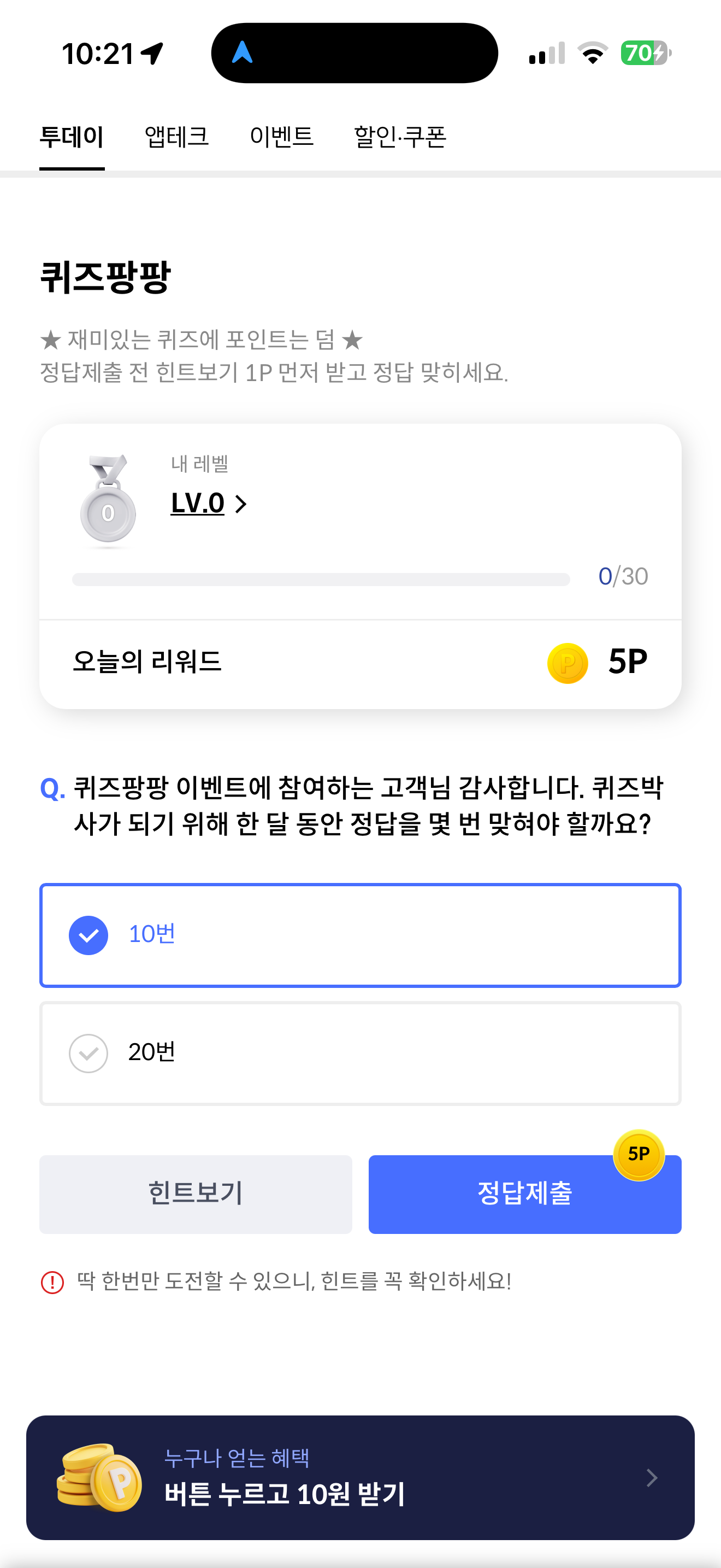 퀴즈팡팡 이벤트에 참여하는 고객님 감사합니다. 퀴즈박사가 되기 위해 한 달 동안 정답을 몇 번 맞혀야 할까요? 보기는 1. 10번 2. 20번 입니다