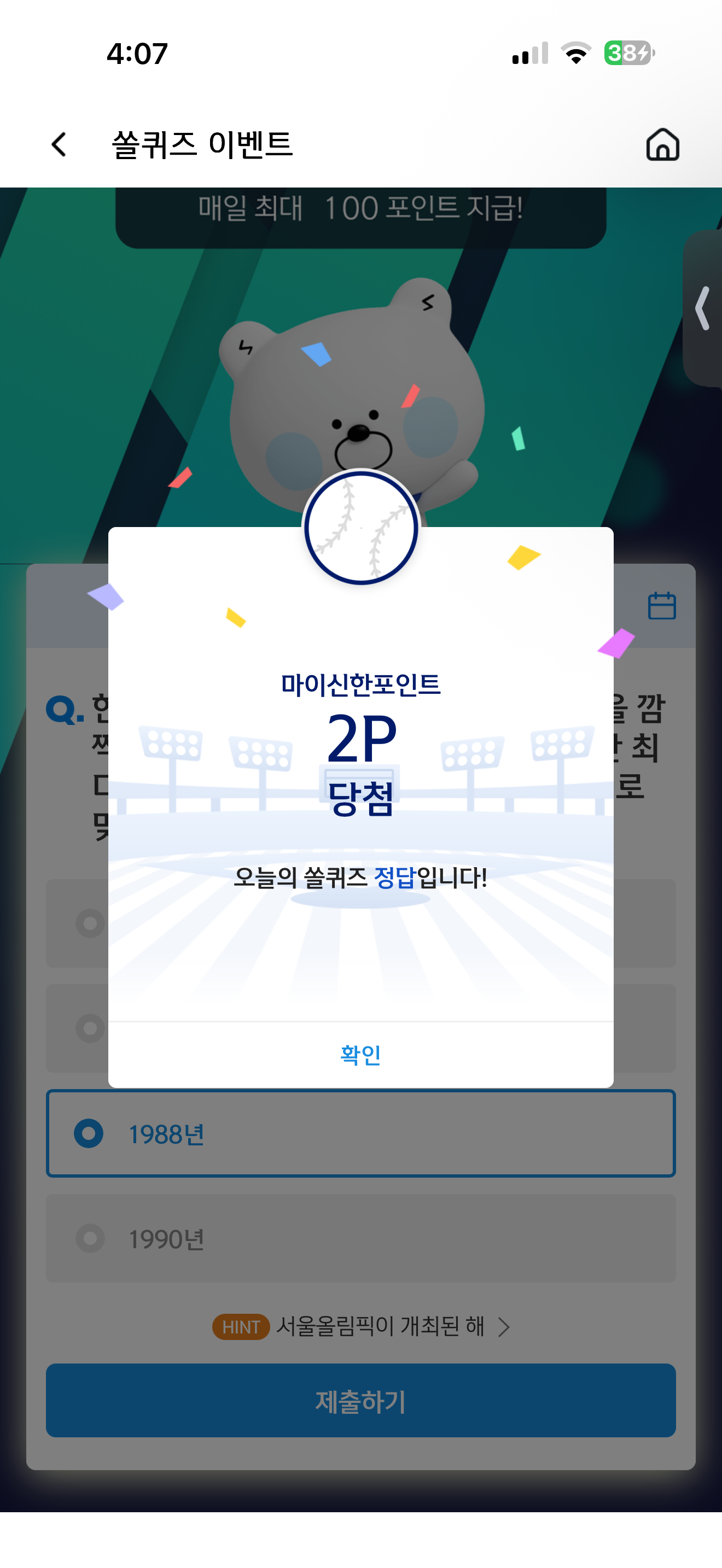 신한 슈퍼SOL 야구/상식 쏠퀴즈 정답은 1988년 입니다