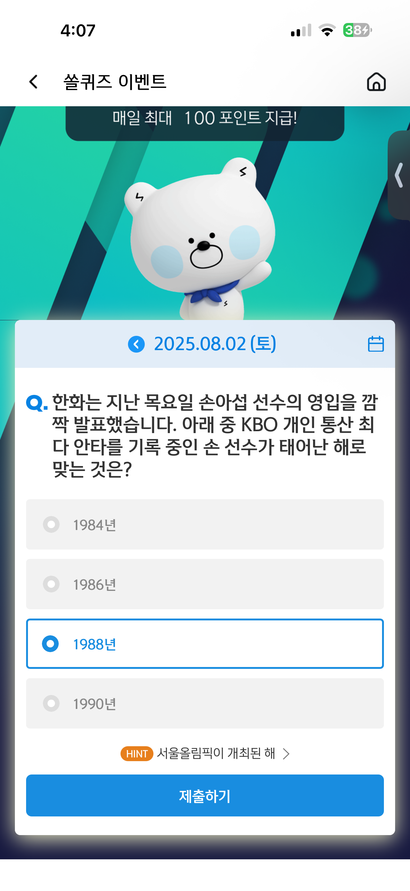 신한 슈퍼SOL 야구/상식 쏠퀴즈 8월 2일 정답(한화는 지난 목요일 손아섭 선수의 영입을 깜짝 발표했습니다. 아래 중 KBO 개인 통산 최다 안타를 기록 중인 손 선수가 태어난 해로 맞는 것은?)