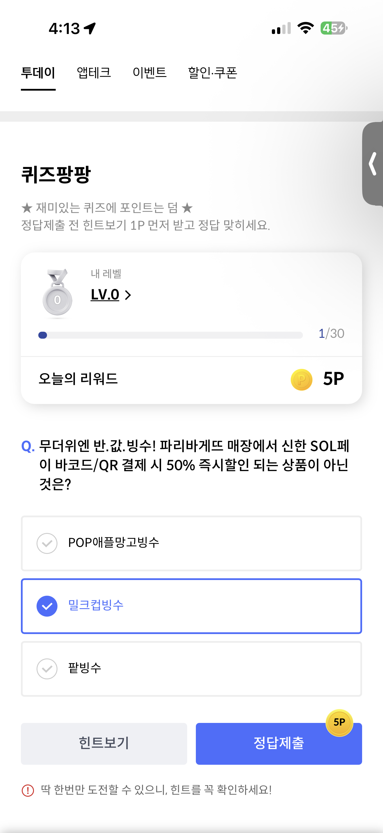 무더위엔 반.값.빙수! 파리바게뜨 매장에서 신한 SOL페이 바코드/QR 결제 시 50% 즉시할인 되는 상품이 아닌 것은? 보기는 1. POP애플망고빙수 2. 밀크컵빙수 3. 팥빙수 입니다.