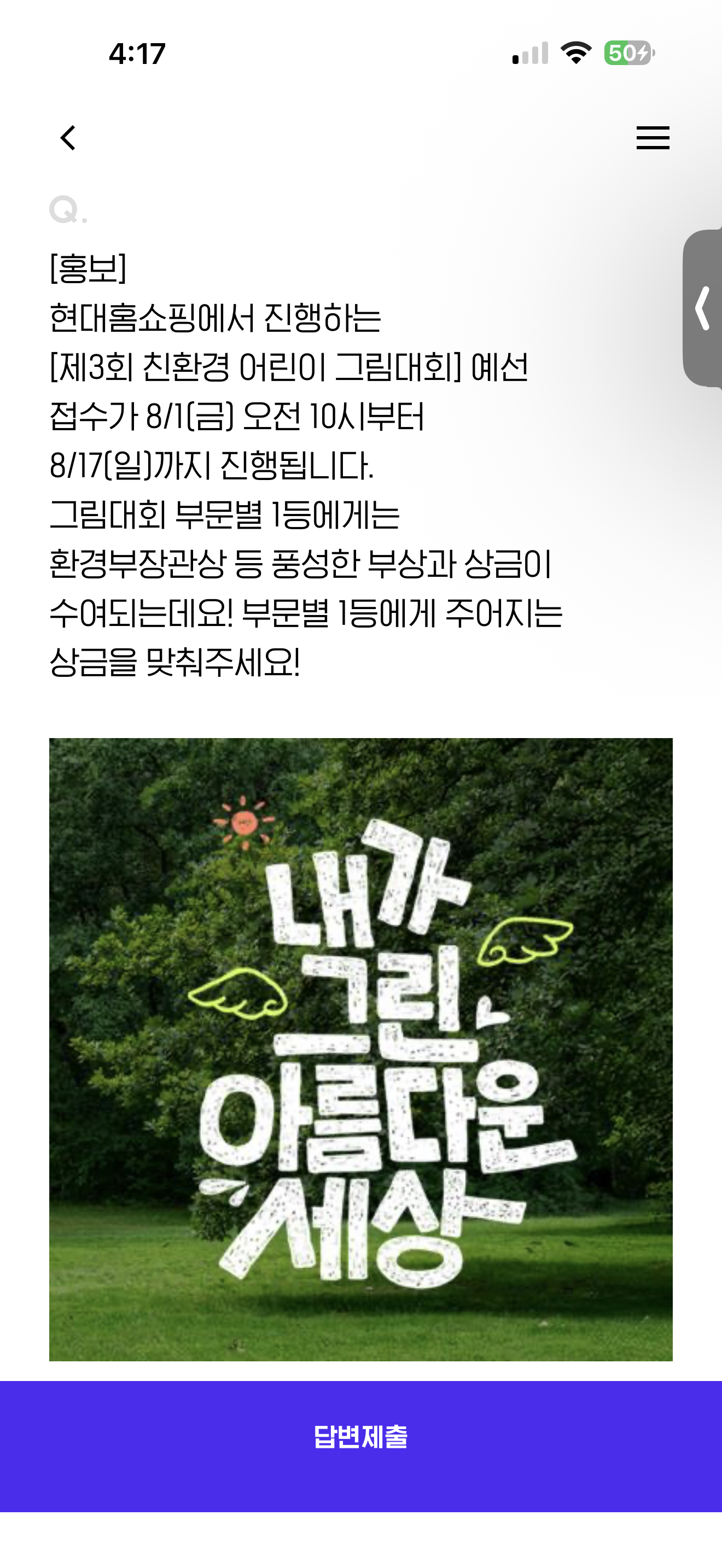 제3회 친환경 어린이 그림대회] 예선 접수가 8/1(금) 오전 10시부터 8/17(일)까지 진행됩니다. 그림대회 부문별 1등에게는 환경부장관상 등 풍성한 부상과 상금이 수여되는데요! 부문별 1등에게 주어지는 상금을 맞춰주세요! 보기는 1. 100만 H.Point 2. 50만 H.Point 3. 20만 H.Point 4. 10만 H.Point 입니다
