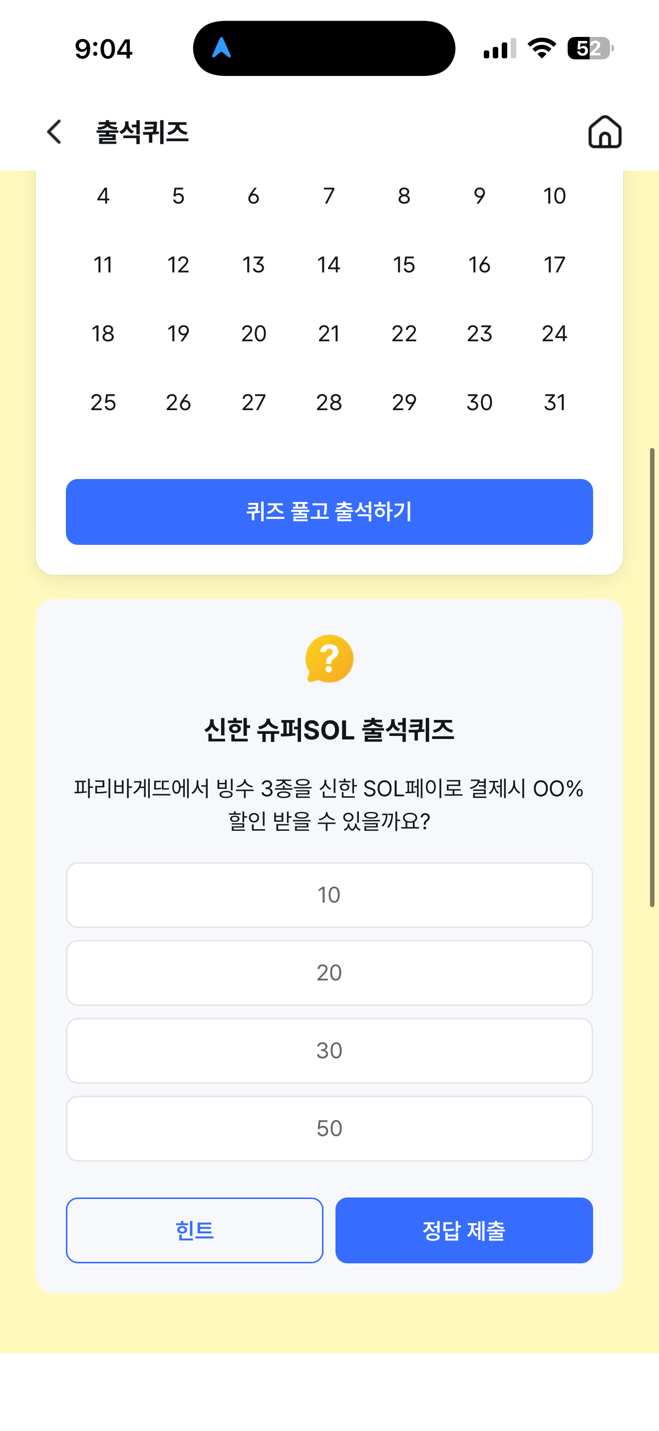 신한 슈퍼SOL 출석퀴즈 정답은 50 입니다