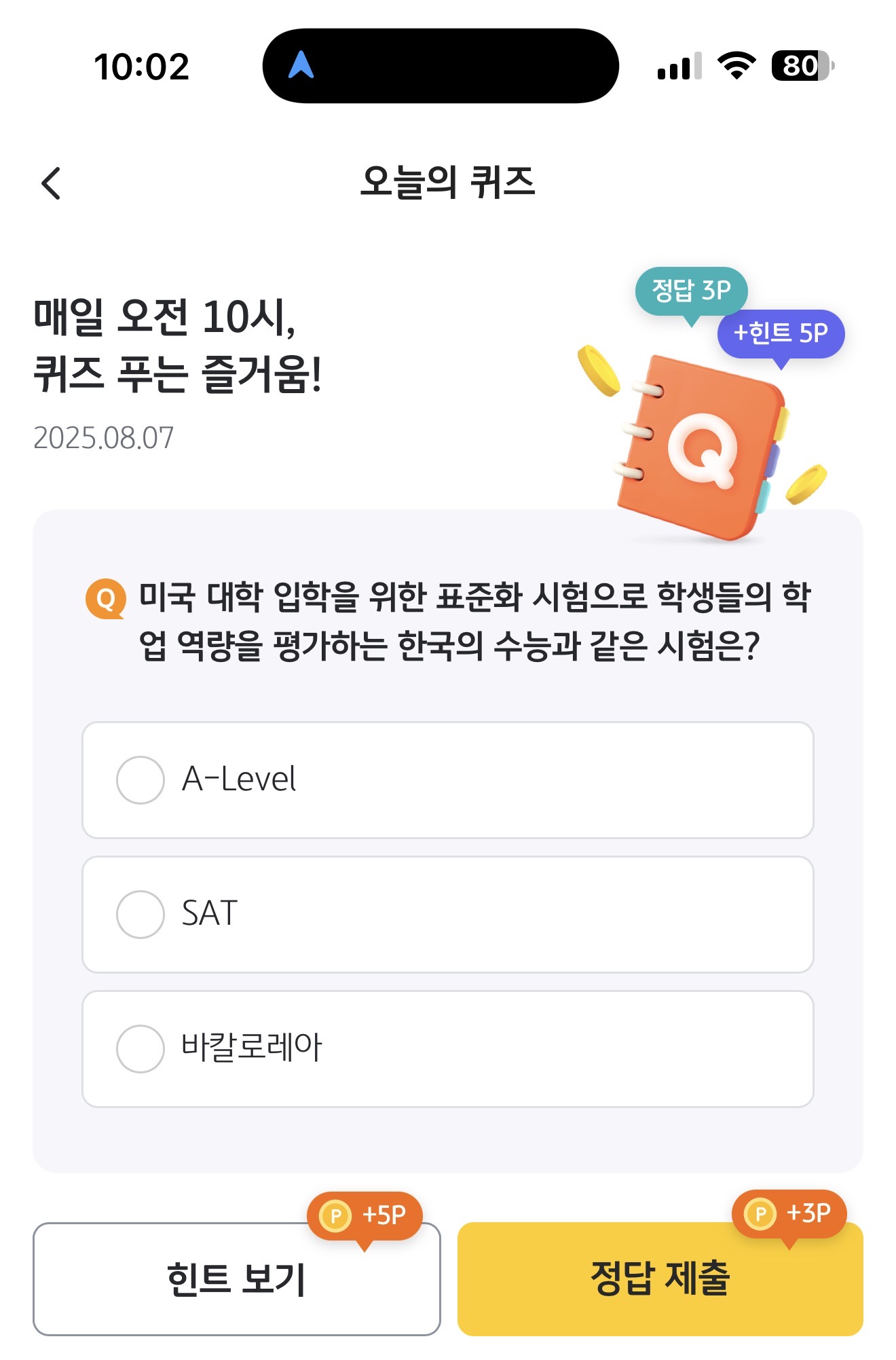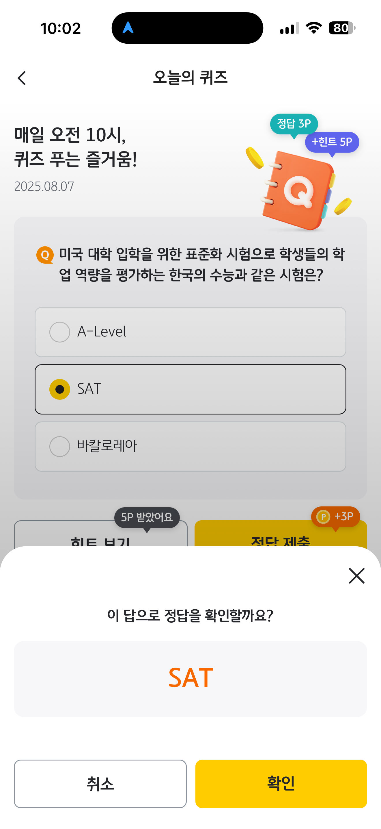 KB Pay 오늘의 퀴즈 정답은 SAT 입니다