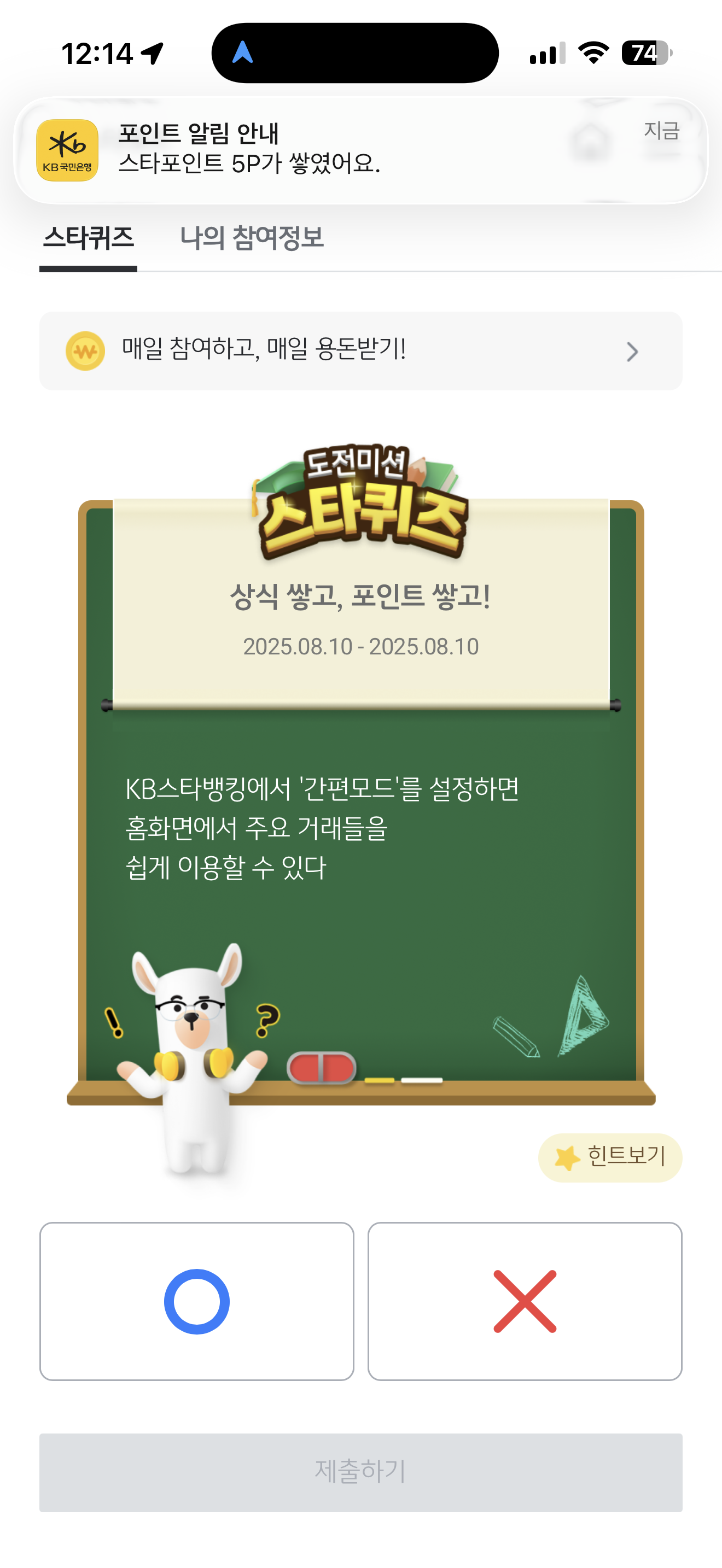 KB스타뱅킹 스타퀴즈 정답은 O 입니다