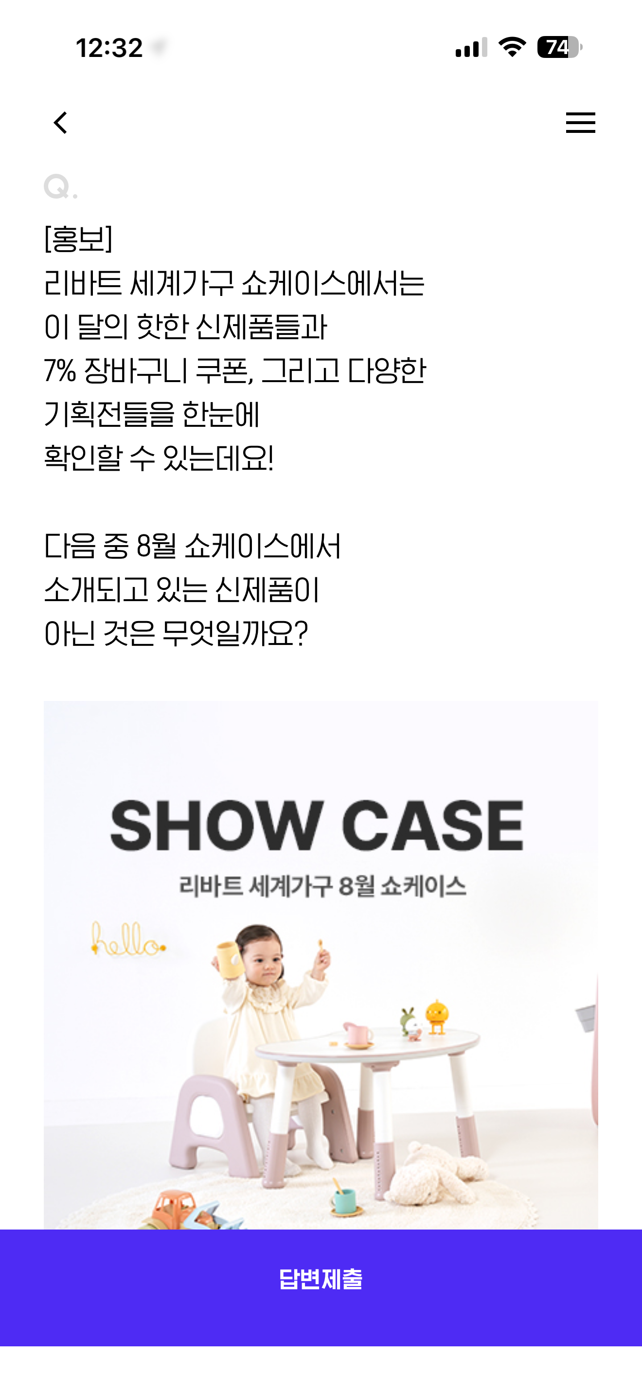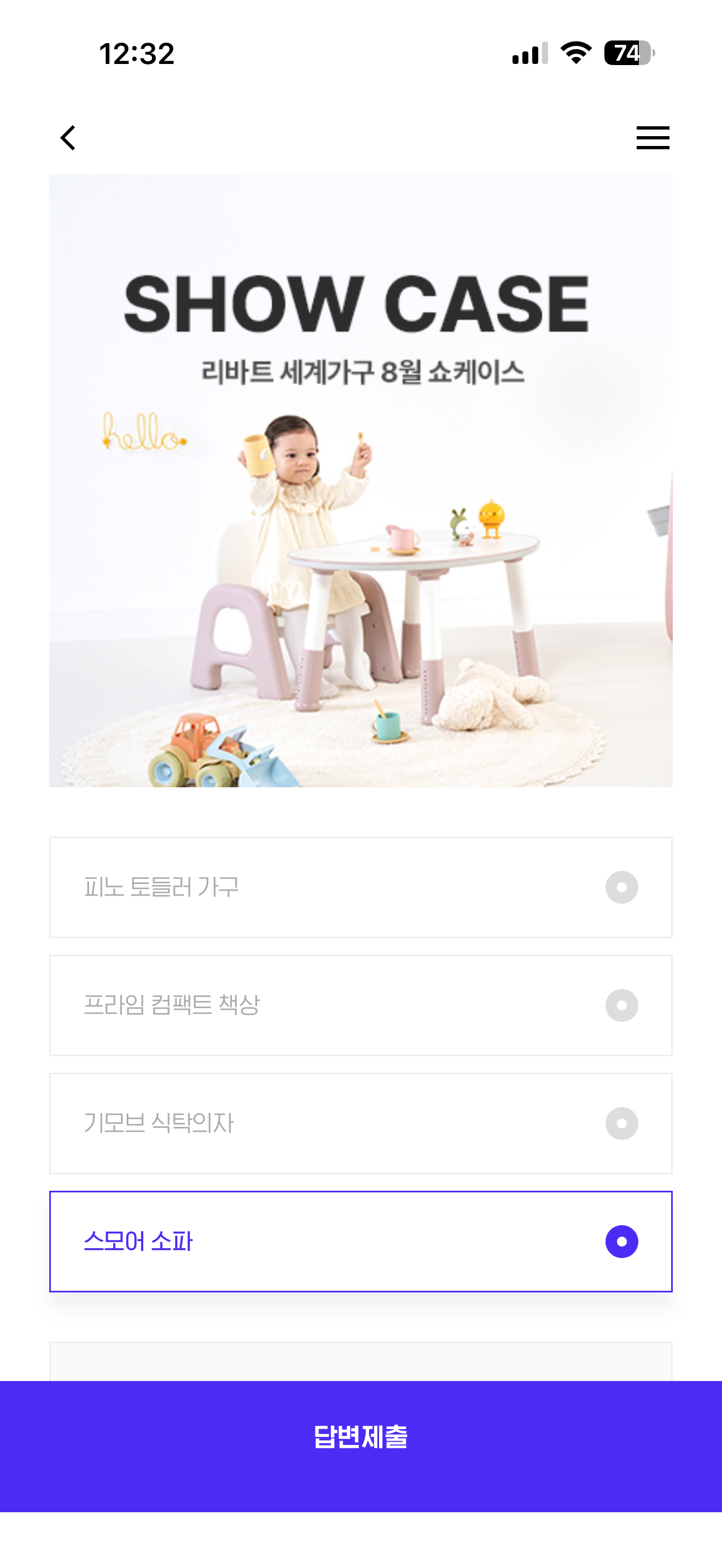 리바트 세계가구 쇼케이스에서는 이 달의 핫한 신제품들과 7% 장바구니 쿠폰, 그리고 다양한 기획전들을 한눈에 확인할 수 있는데요! 다음 중 8월 쇼케이스에서 소개되고 있는 신제품이 아닌 것은 무엇일까요? 보기는 1. 피노 토들러 가구 2. 프라임 컴팩트 책상 3. 기모브 식탁의자 4. 스모어 소파 입니다
