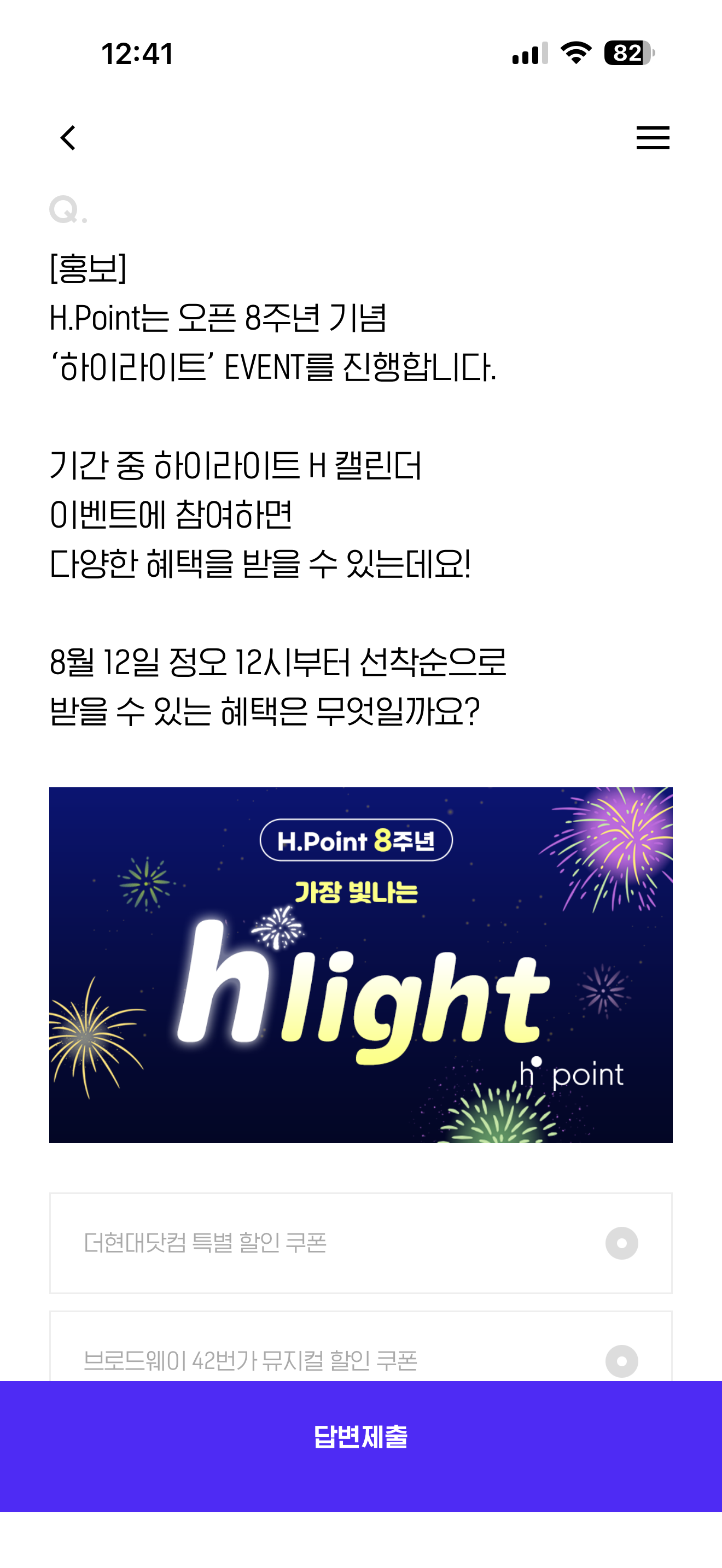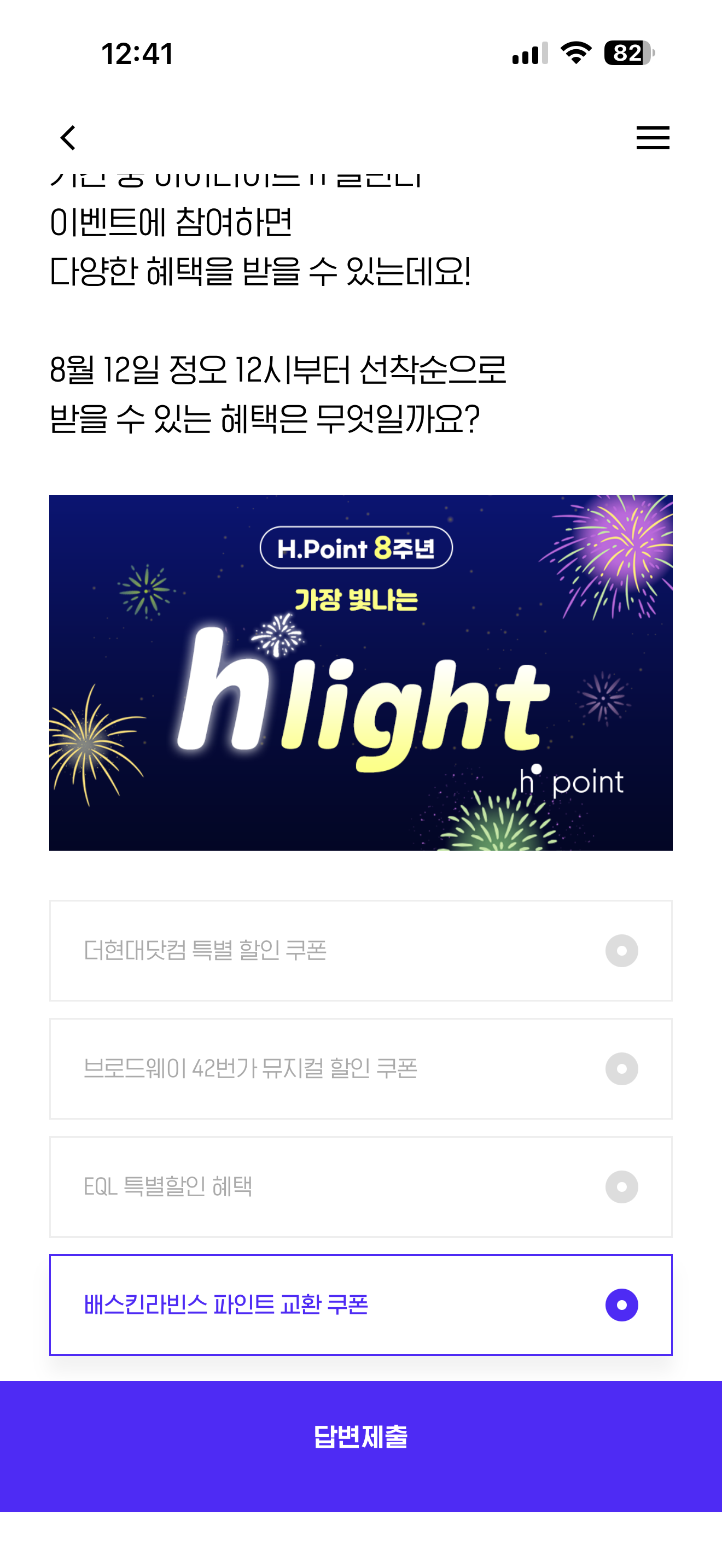 H.Point는 오픈 8주년 기념 '하이라이트' EVENT를 진행합니다. 기간 중 하이라이트 H 캘린더 이벤트에 참여하면 다양한 혜택을 받을 수 있는데요! 8월 12일 정오 12시부터 선착순으로 받을 수 있는 혜택은 무엇일까요? 보기는 1. 더현대닷컴 특별 할인 쿠폰 2. 브로드웨이 42번가 뮤지컬 할인 쿠폰 3. EQL 특별할인 혜택 4. 베스킨라빈스 파인트 교환 쿠폰