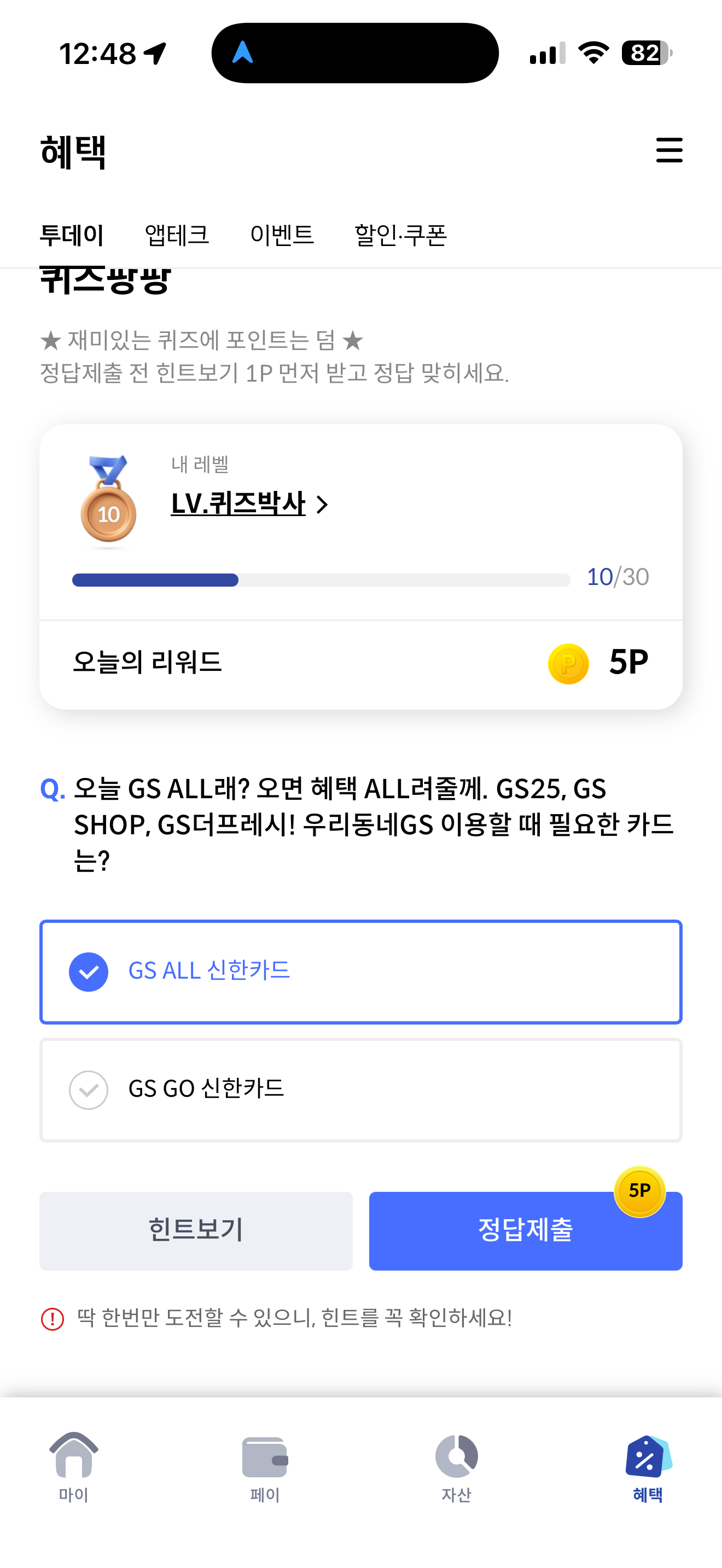 신한카드 퀴즈팡팡 정답은 GS ALL 신한카드 입니다