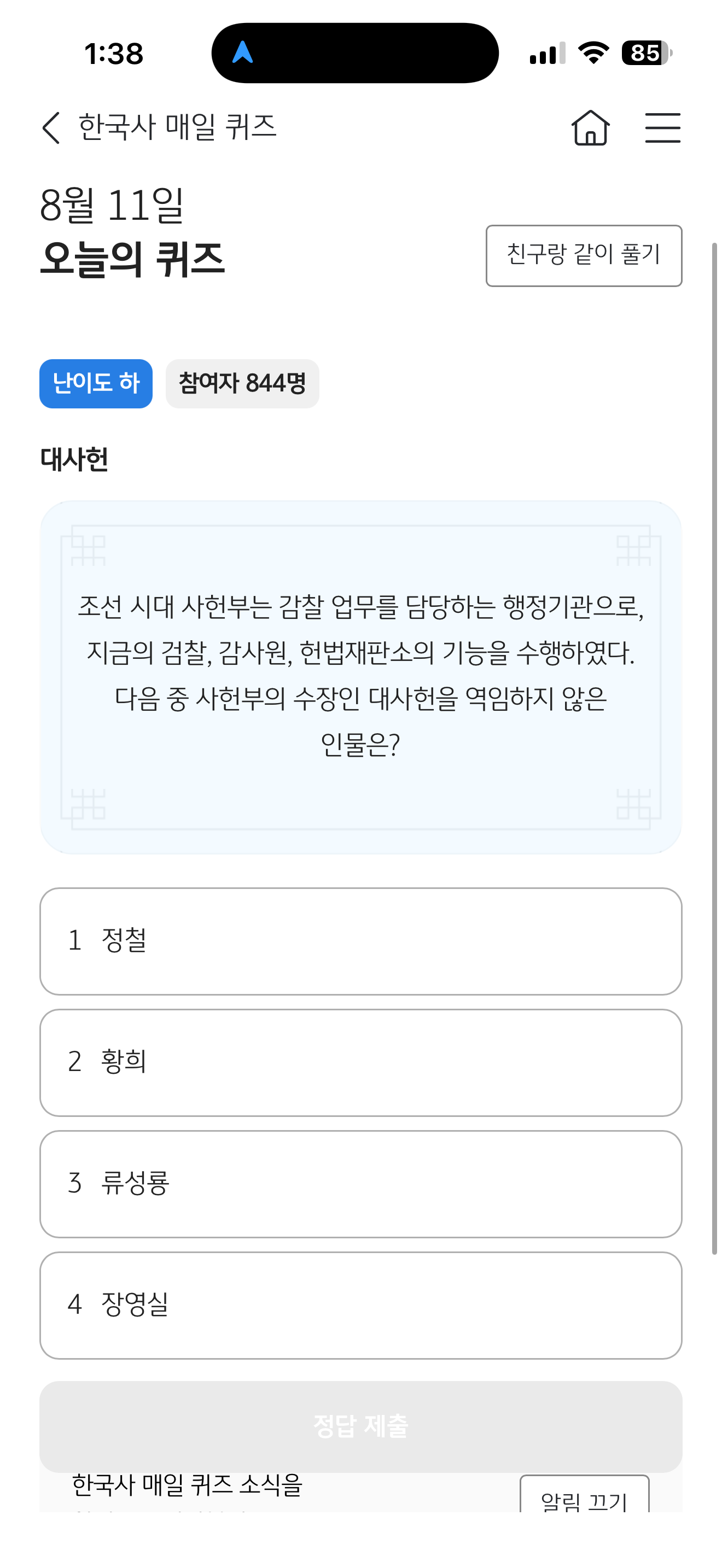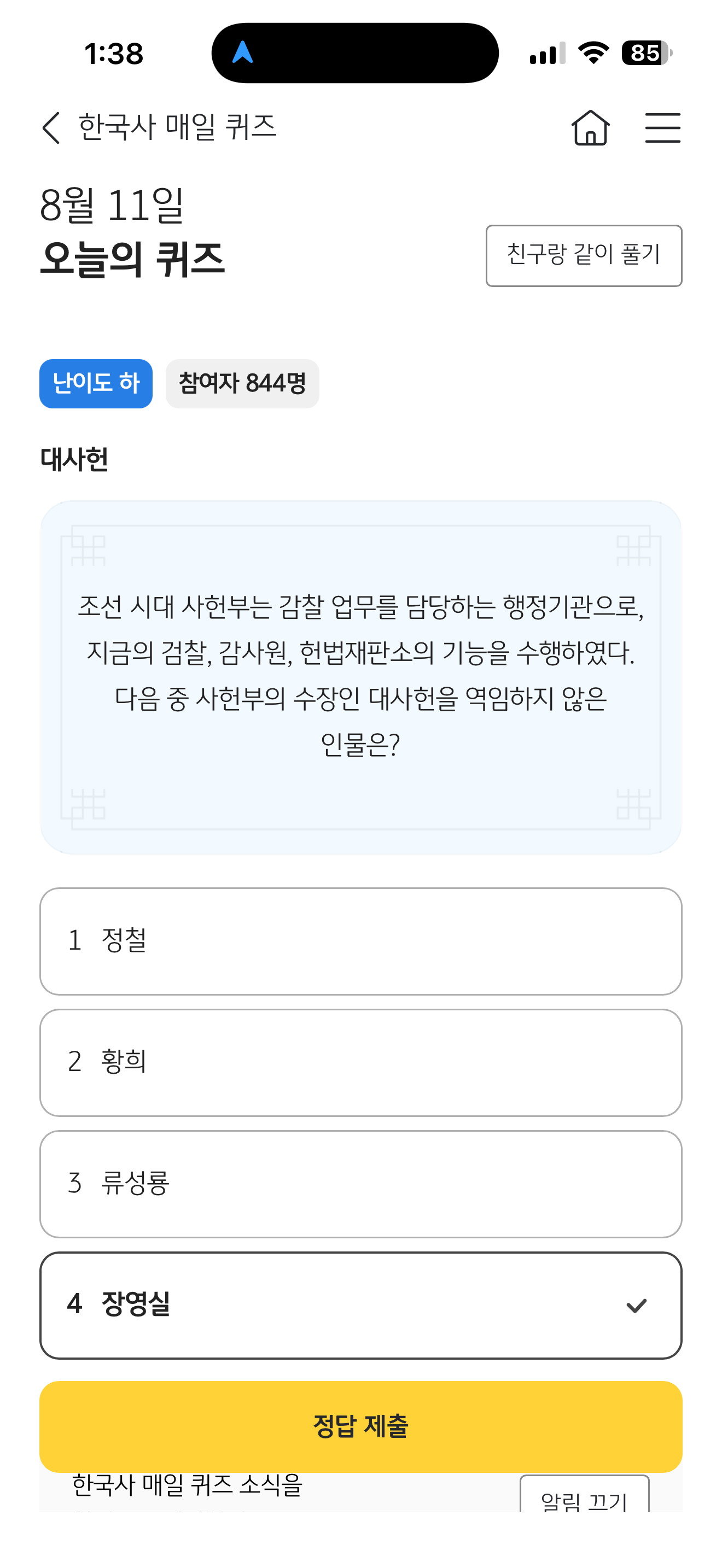 KB스타뱅킹 한국사 매일 퀴즈 8월 11일 문제입니다