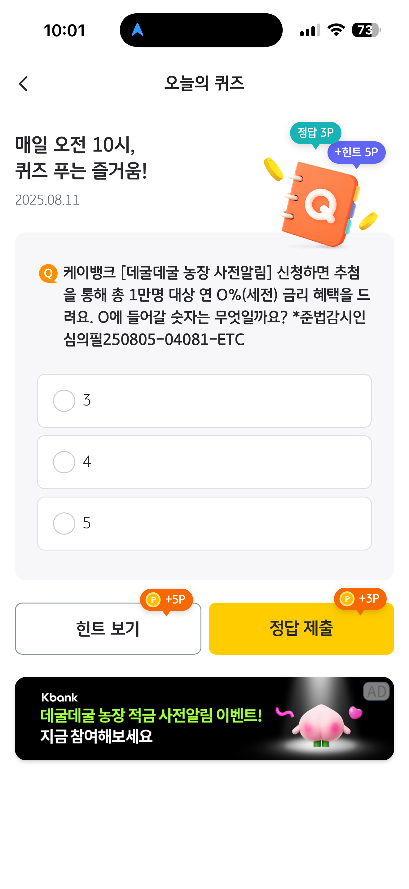 케이뱅크 [데굴데굴 농장 사전알림] 신청하면 추첨을 통해 총 1만명 대상 연 O%(세전) 금리 혜택을 드려요. O에 들어갈 숫자는 무엇일까요? *준법감시인심의필250805-04081-ETC 보기는 1. 3 2. 4 3. 5 입니다