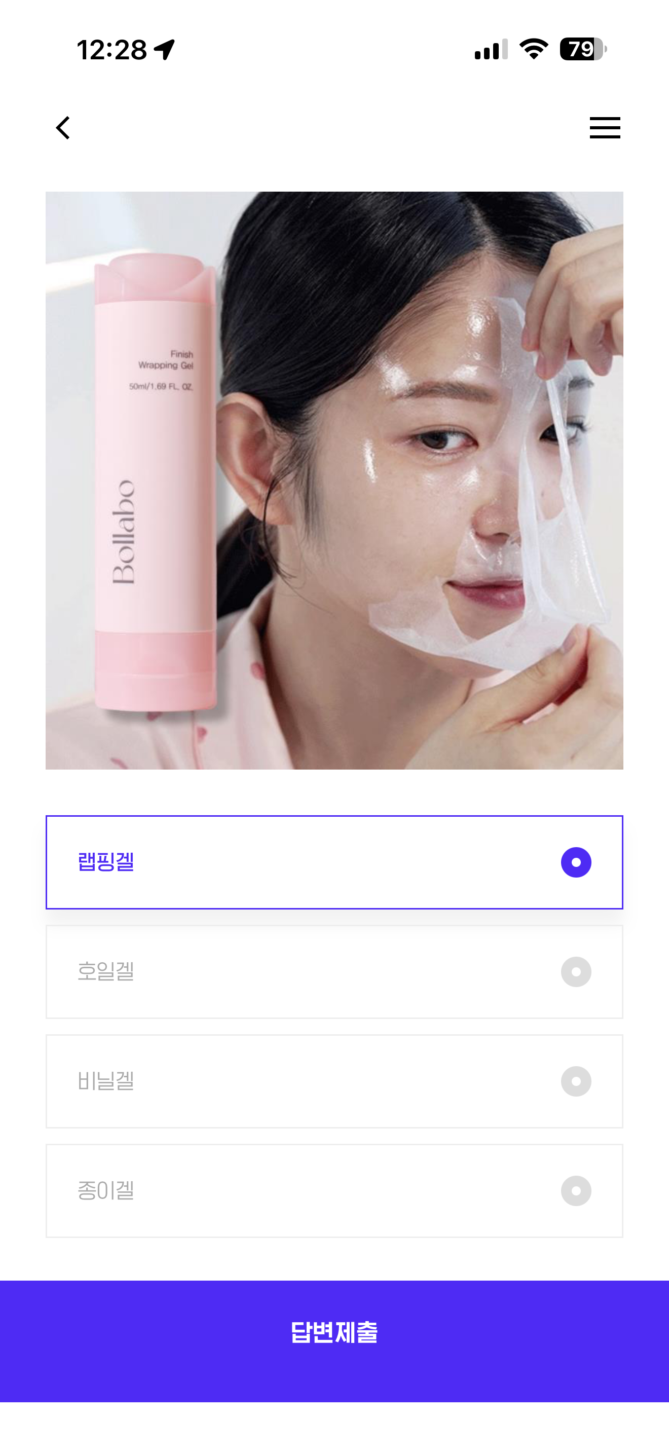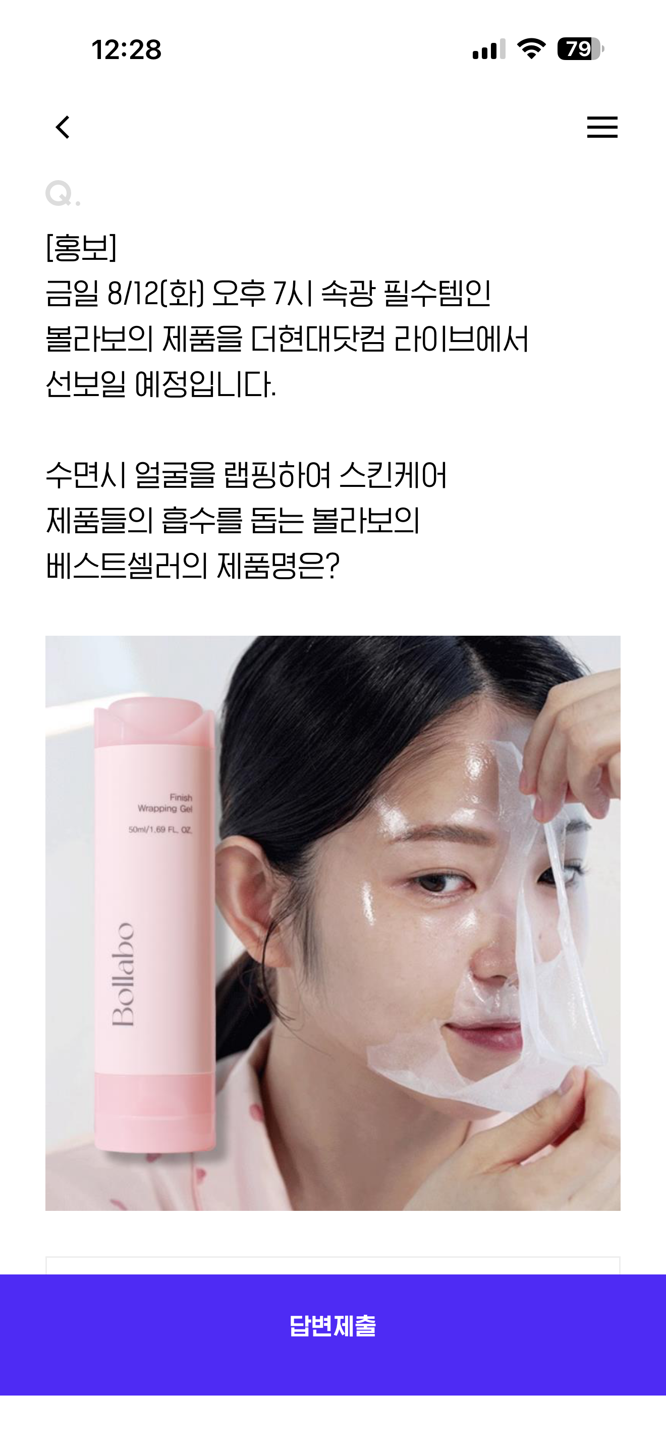 금일 8/12(화) 오후 7시 속광 필수템인 볼라보의 제품을 더현대닷컴 라이브에서 선보일 예정입니다. 수면시 얼굴을 랩핑하여 스킨케어 제품들의 흡수를 돕는 볼라보의 베스트셀러의 제품명은? 보기는 1. 랩핑겔 2. 호일겔 3. 비닐겔 4. 종이겔 입니다