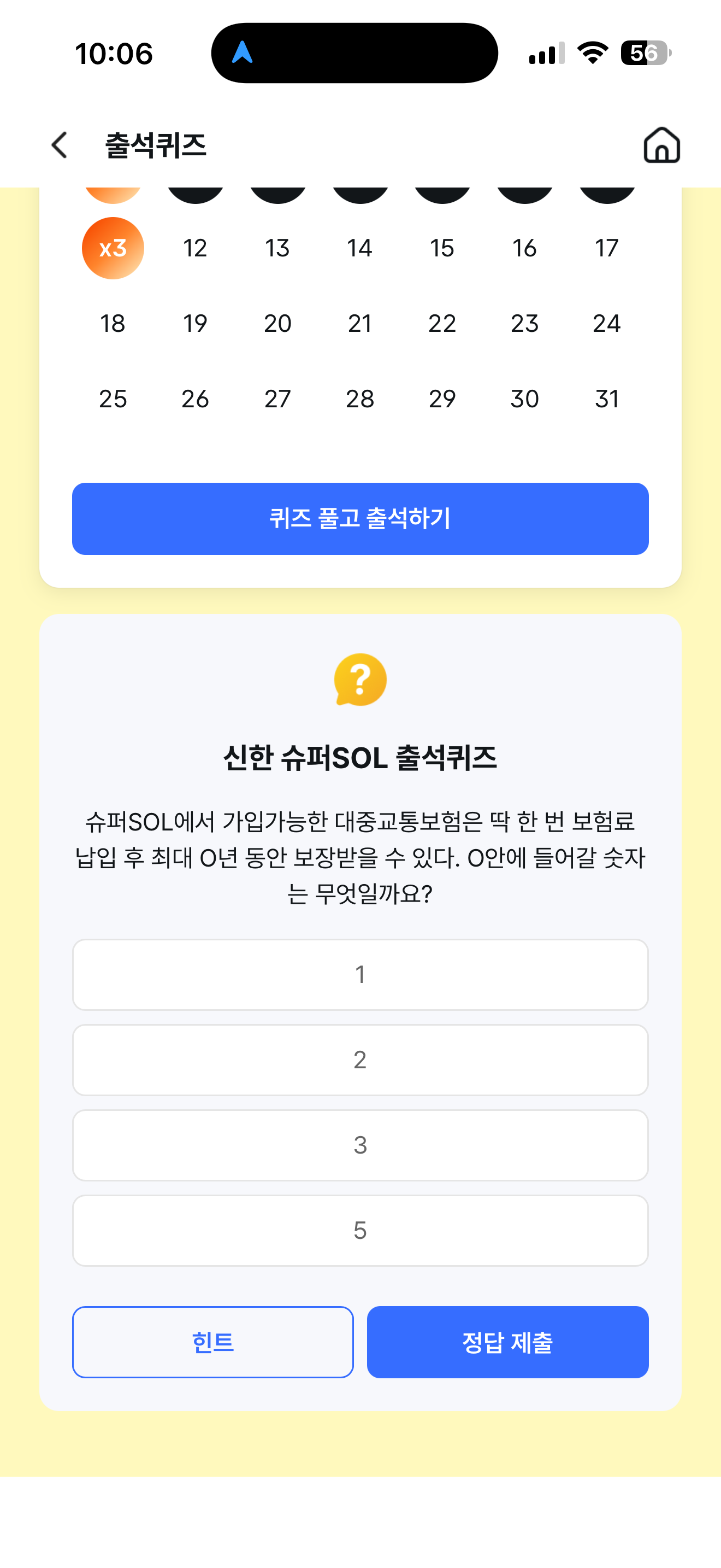 신한 슈퍼SOL 출석퀴즈 8월 12일 정답(슈퍼SOL에서 가입가능한 대중교통보험은 딱 한 번 보험료 납입 후 최대 O년 동안 보장받을 수 있다. O안에 들어갈 숫자는 무엇일까요?)