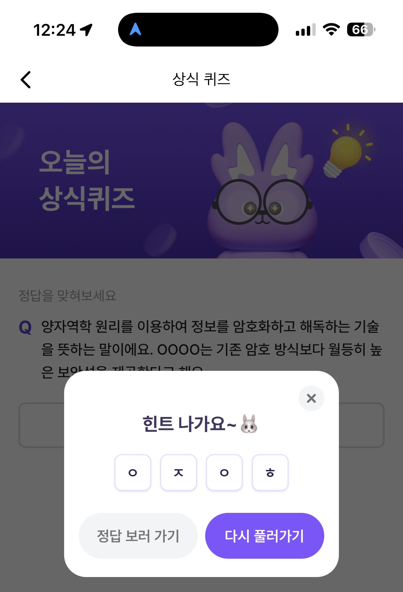 비트버니 오늘의 퀴즈 8월 13일 ㅇㅈㅇㅎ 정답(양자역학 원리를 이용하여 정보를 암호화하고 해독하는 기술을 뜻하는 말이에요. OOOO는 기존 암호 방식보다 월등히 높은 보안성을 제공한다고 해요)