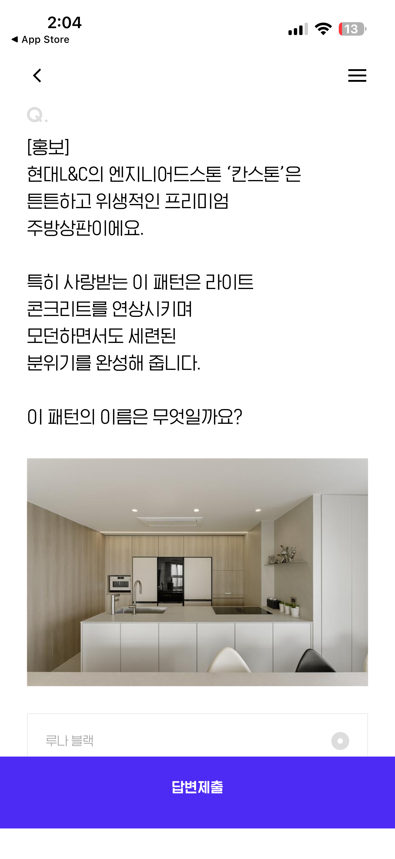 현대L&C의 엔지니어드스톤 '칸스톤'은 튼튼하고 위생적인 프리미엄 주방상판이에요. 특히 사랑받는 이 패턴은 라이트 콘크리트를 연상시키며 모던하면서도 세련된 분위기를 완성해 줍니다. 이 패턴의 이름은 무엇일까요? 보기는 1. 루나 블랙 2. 루나 화이트 3. 루나 블루 4. 루나 베이지 입니다
