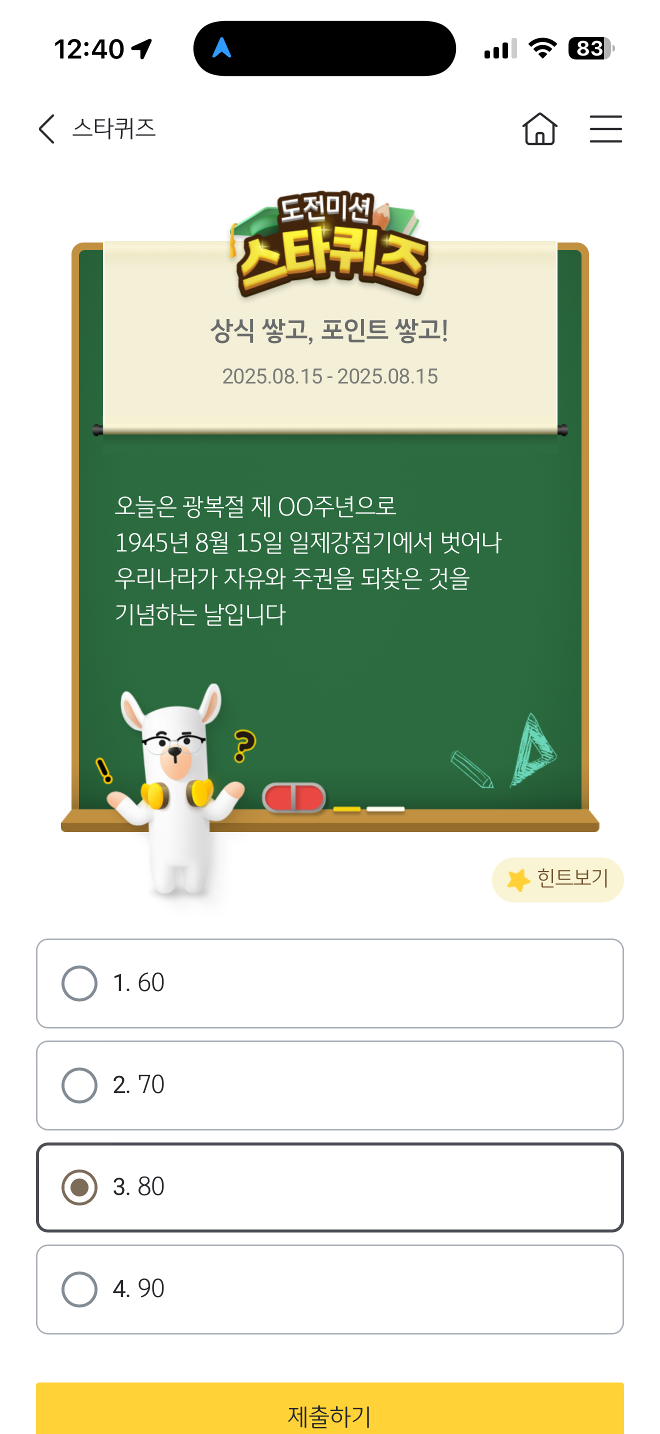 KB스타뱅킹 스타퀴즈 정답은 80 입니다
