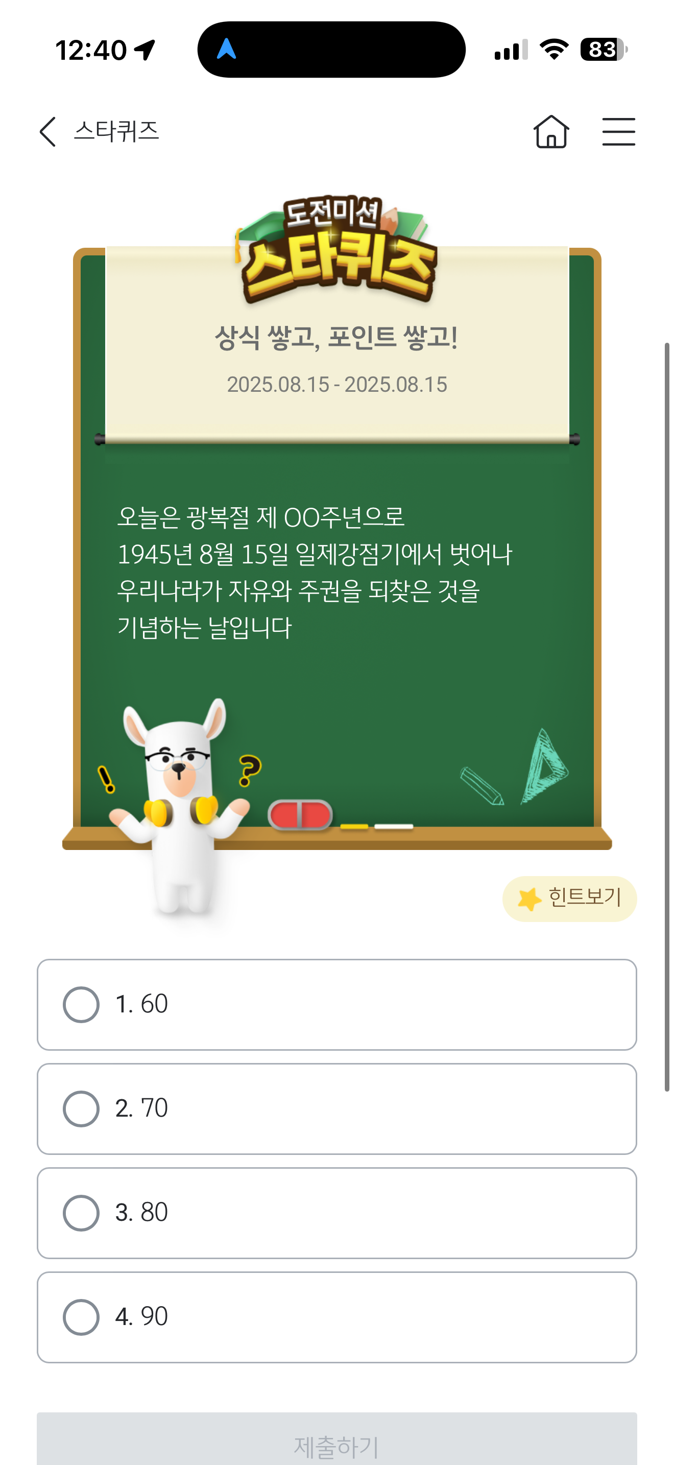 오늘은 광복절 제 OO주년으로 1945년 8월 15일 일제강점기에서 벗어나 우리나라가 자유와 주권을 되찾은 것을 기념하는 날입니다 보기는 1. 60 2. 70 3. 80 4. 90 입니다. 오늘은 정말 뜻깊은 날이죠 광복절 몇 주년인지 꼭 알아두세요