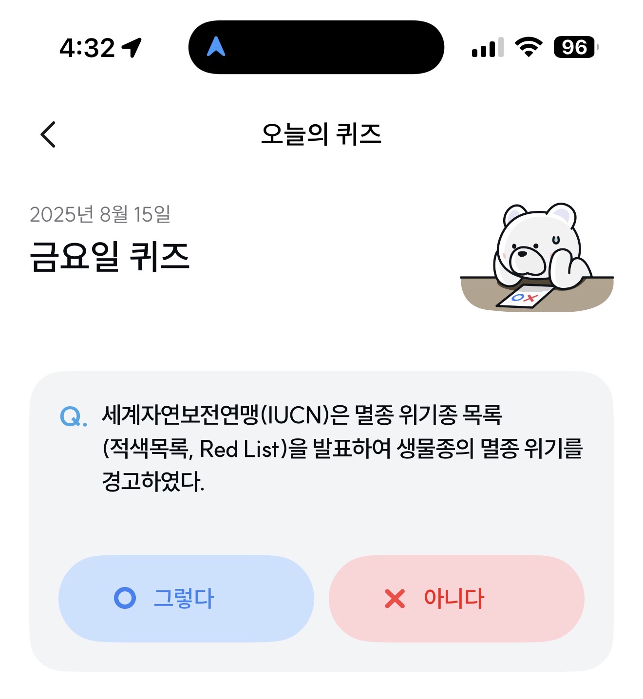 세계자연보전연맹(IUCN)은 멸종 위기종 목록(적색목록, Red List)을 발표하여 생물종의 멸종 위기를 경고하였다. 그렇다 아니다 선택하면 되는데요. 세계자연보전연맹은 다양한 환경 위기를 대응하고 있는데요. 과연 멸종위기를 경고하고 있을까요?